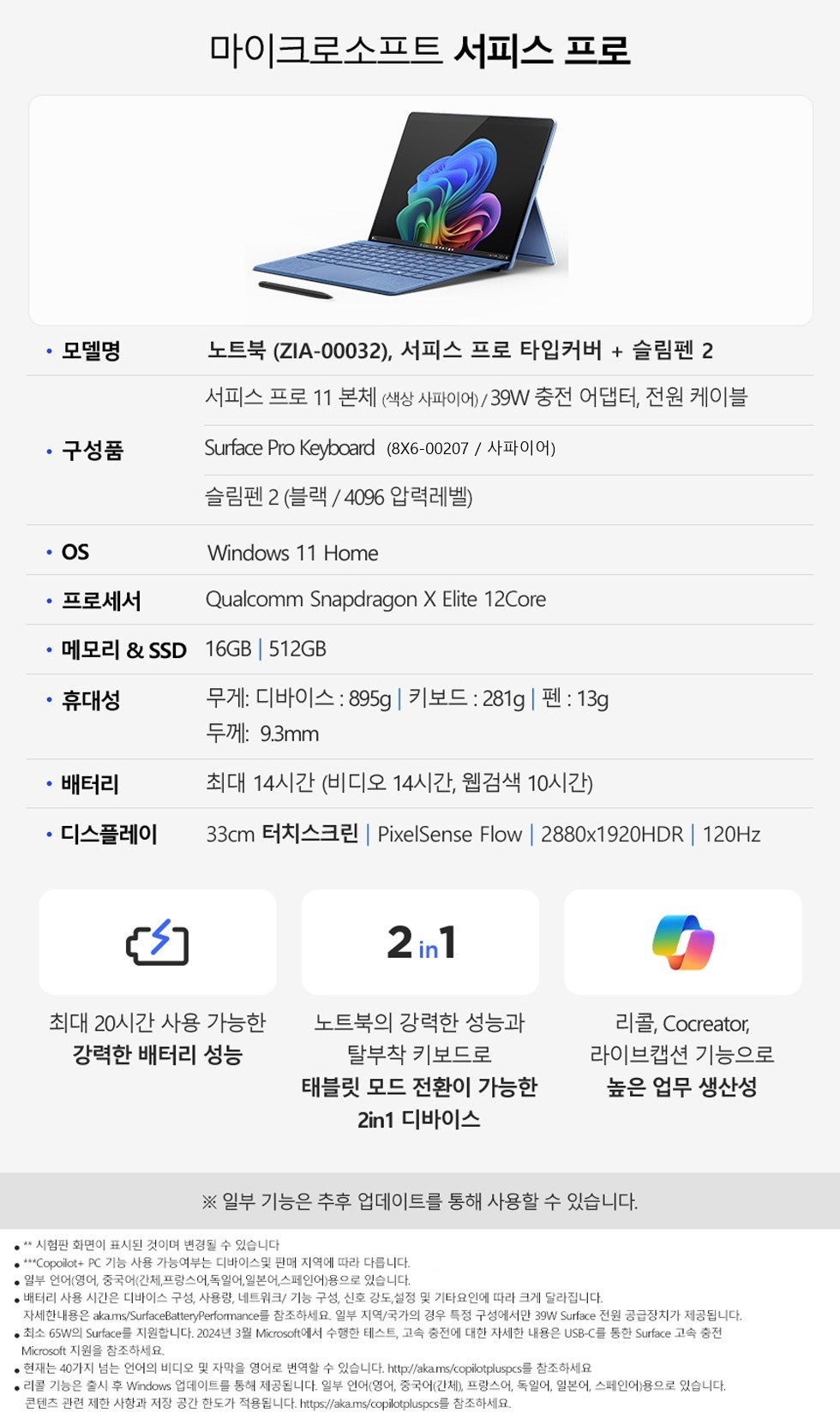 마이크로소프트 2024 서피스 프로 11 13 스냅드래곤 X 엘리트 + 키보드 + 슬림펜2노트북 사파이어 + 키보드 사파이어 · 512GB · 16GB · WIN11 Home · 노트북(ZIA-00050), 키보드+슬림펜2(8X6-00207)