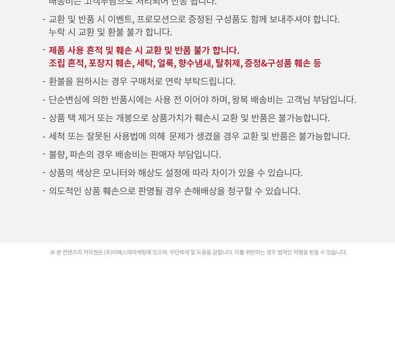 - ㆍ모니터 해상도의 차이로 인해 색상이나 이미지가 실제와 달라, 고객이 단순 변심으로 교환/반품을 무료로 요청하는 경우