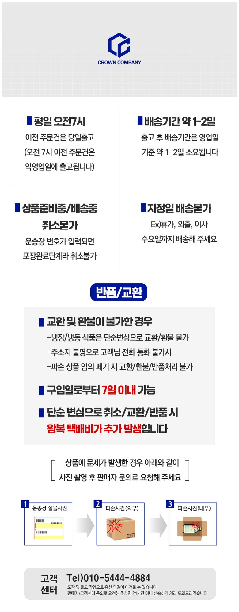 - ㆍ모니터 해상도의 차이로 인해 색상이나 이미지가 실제와 달라, 고객이 단순 변심으로 교환/반품을 무료로 요청하는 경우