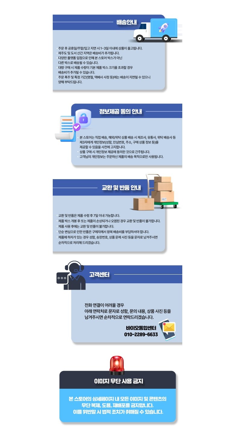 - ㆍ모니터 해상도의 차이로 인해 색상이나 이미지가 실제와 달라, 고객이 단순 변심으로 교환/반품을 무료로 요청하는 경우
