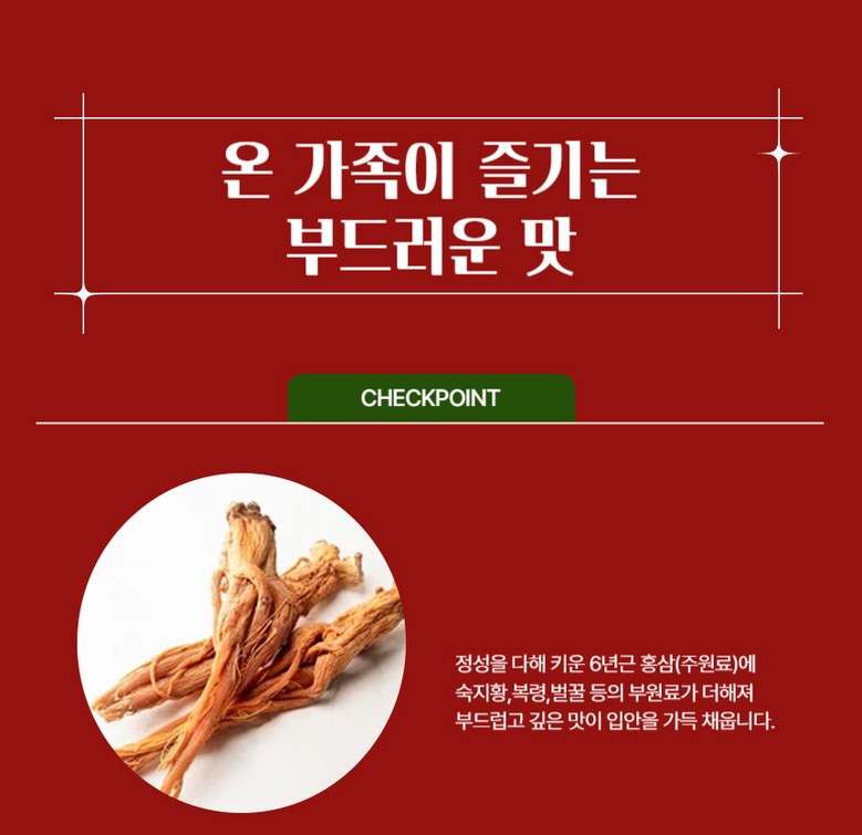 | 원료명 및 함량 | 주원료- 홍삼농축액(6년근,고형분 60%, 진세노사이드 Rg1+Rb1+Rg3 5.5mg/g, 국산) 11.35% (운료삼배합비율 : 홍삼근 70%, 홍미삼 30%), 말토덱스트린, 식물혼합농축액{숙지황(국산), 복령(국산)}, 프락토올리고당, 벌꿀(국산), 아가베시럽, 천연허브향 | 영양정보 | 1일 섭취량 : 20g 1일 섭취량 당 함량 열량 60kcal0, 탄수화물 15g(5%), 당류 4g(4%), 단백질 1g미만(1%), 지방0g(0%), 나트륨 5mg(0%) 기능성분 또는 지표성분 : 진세노사이드(Rg1+Rb1+Rg3 5.5mg/g) (※ %영양소 기준치 :1일 영양소 기준치에 대한 비율) |