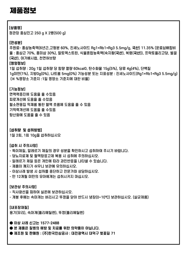| 제품명 | 정관장 홍삼진고 250 g X 2병(500 g) | 제조업소의 명칭과 소재지 | (주)한국인삼공사 : 대전광역시 대덕구 벚꽃길 71 |