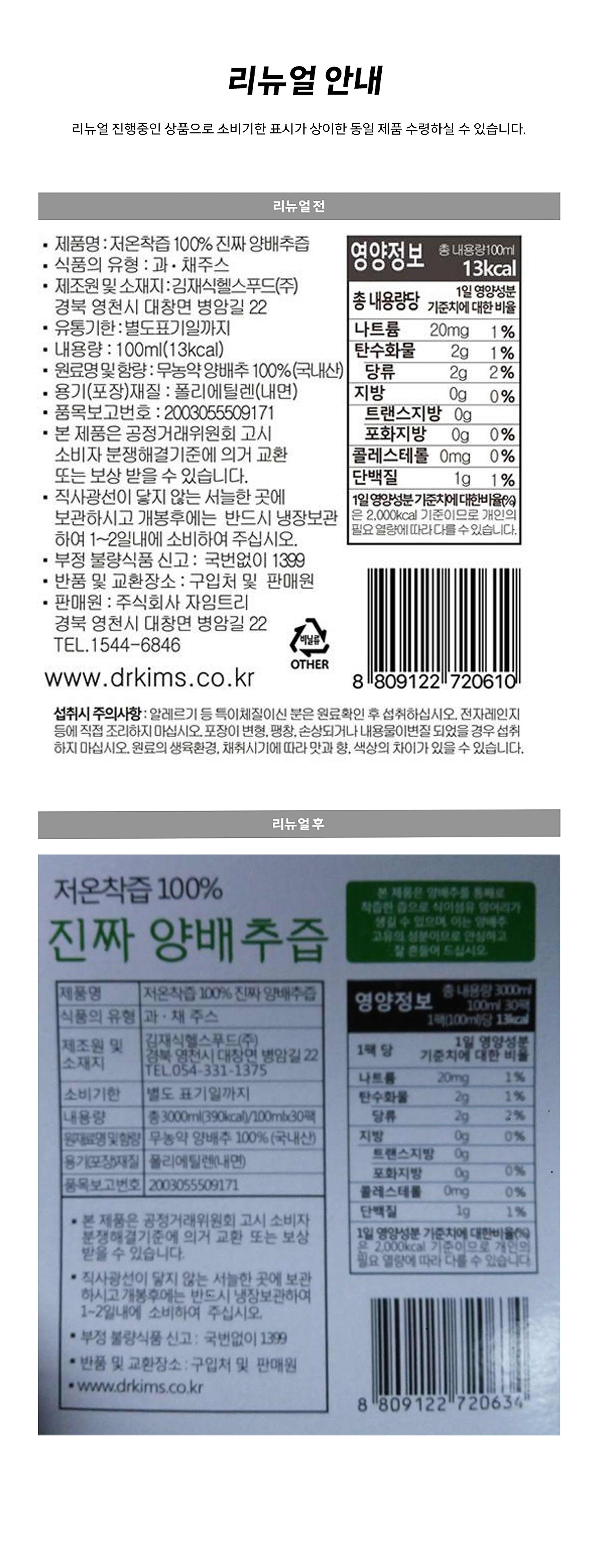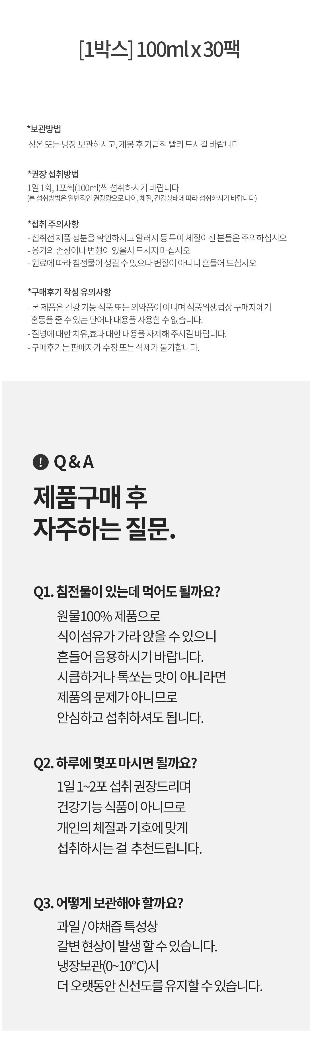 | 포장단위별 내용물의 용량(중량), 수량 | 100ml x 30개, 1개 | 원재료명 및 함량 | 컨텐츠 참조 |