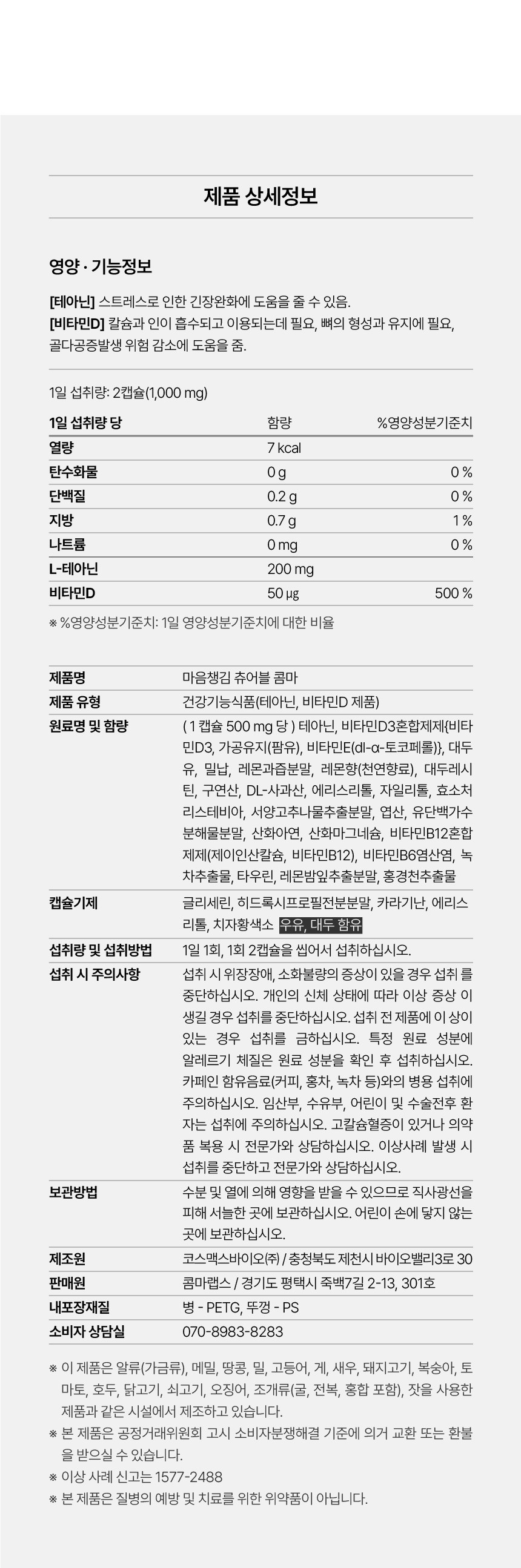 | 제품명 | 마음챙김 츄어블 콤마 | 제조업소의 명칭과 소재지 | 컨텐츠 참조 |