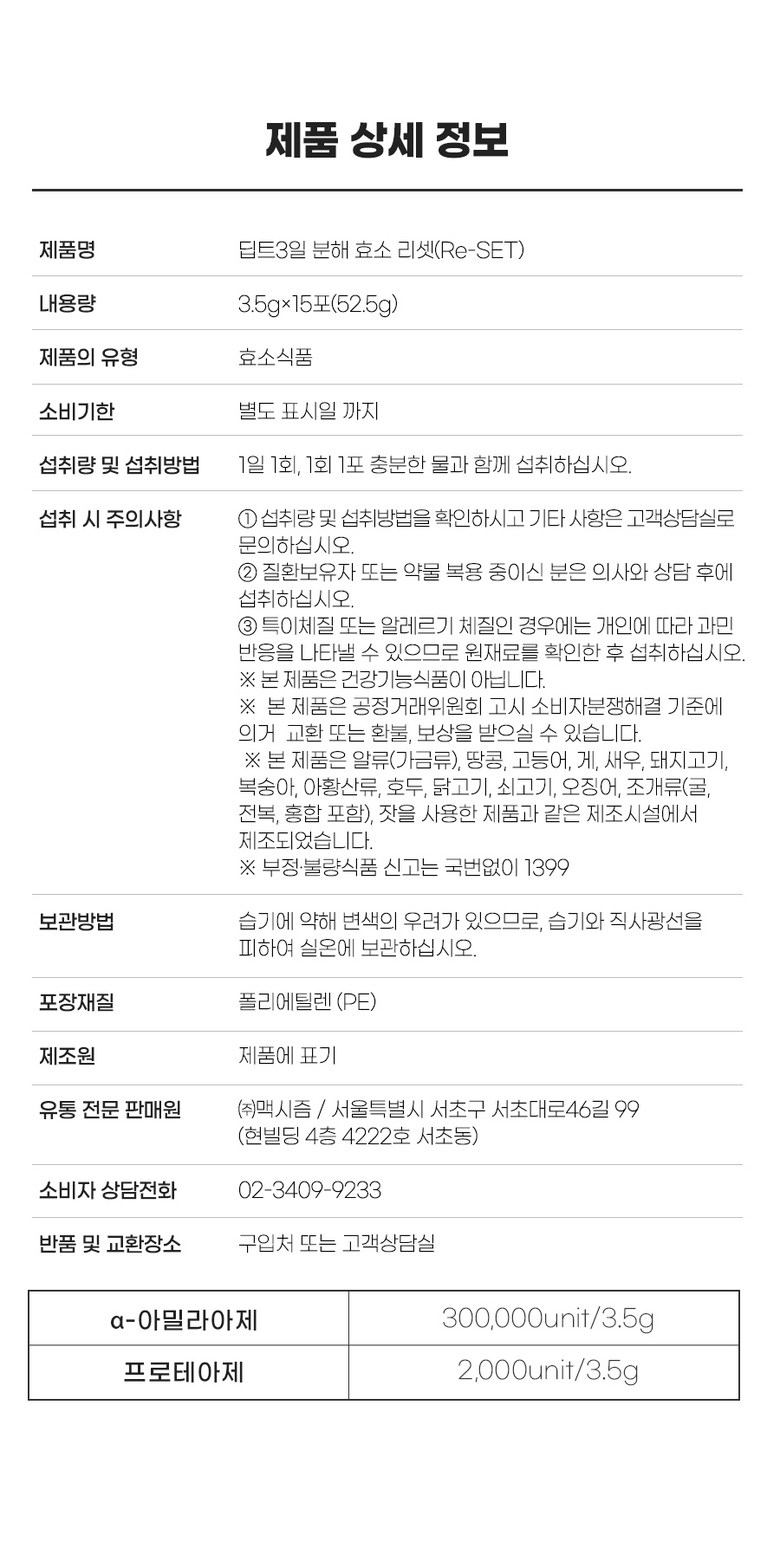 | 원료명 및 함량 | 상품 상세페이지 참조 | 영양정보 | 상품 상세페이지 참조 |