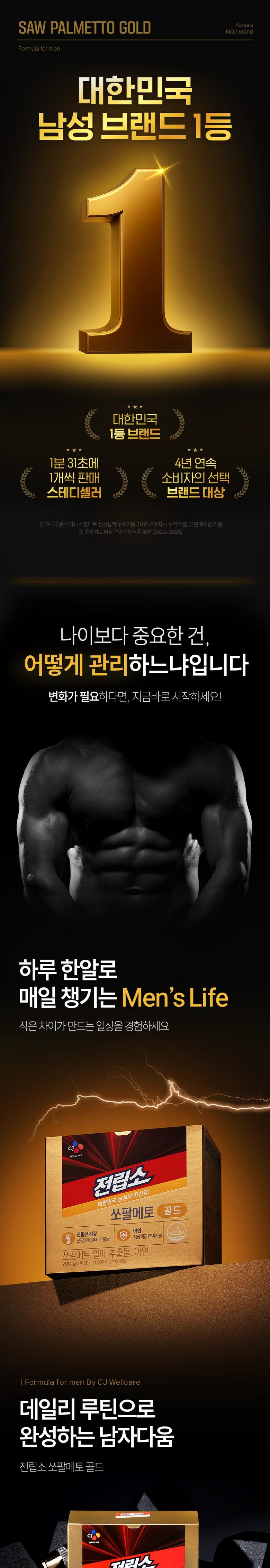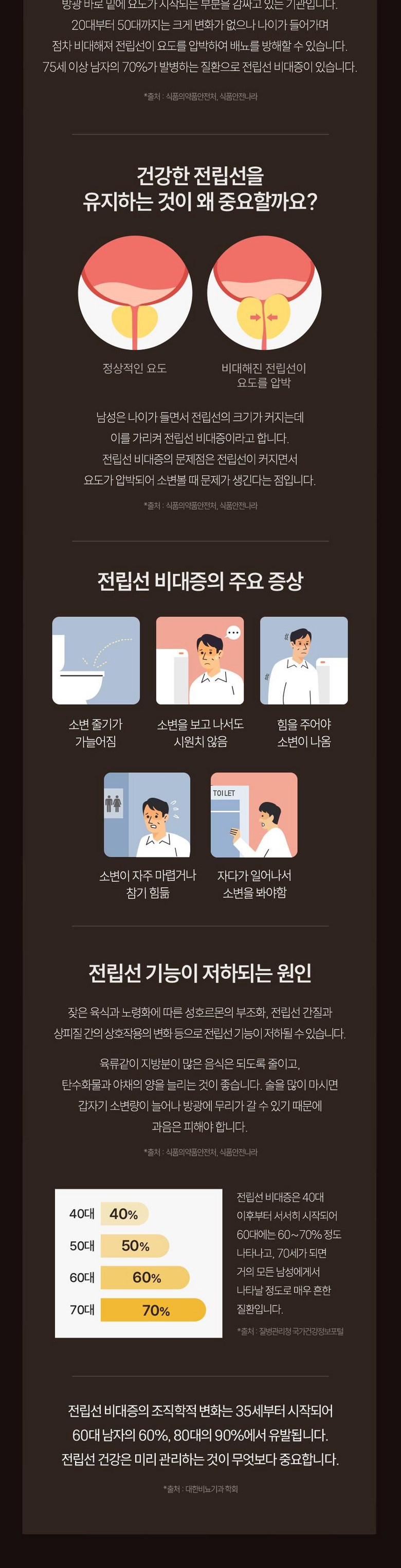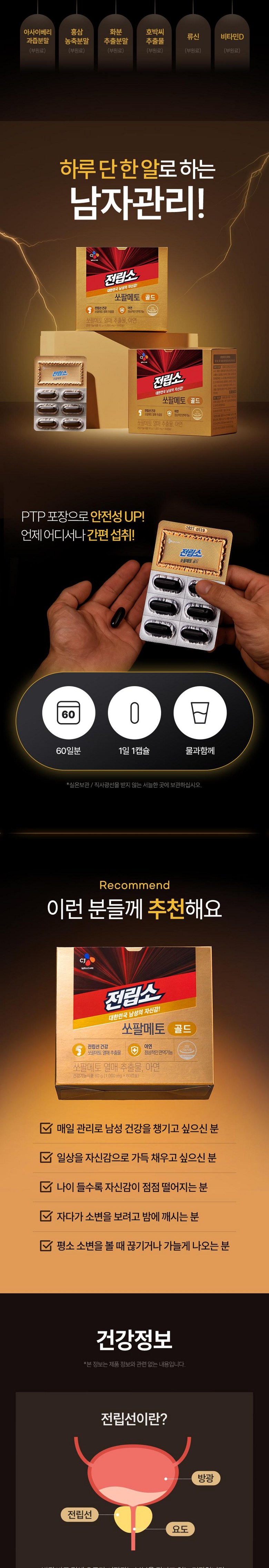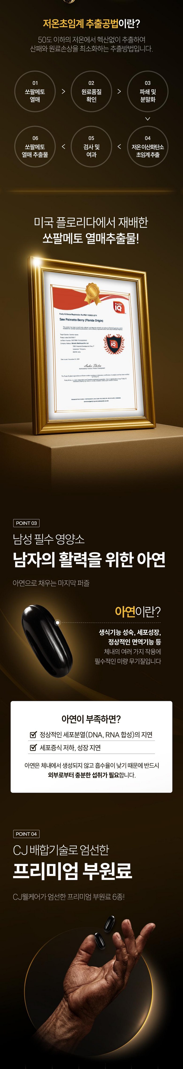 | 원료명 및 함량 | ■ 쏘팔메토오일{인도산, 로르산(Lauricacid) / 배합량 : 쏘팔메토열매 100%}, 황산아연, 포도씨유(스페인산), 밀납(황납), 대두레시틴, 정제수, 글리세린, 화분함유제품(미국산), d-α-토코페롤, 호박씨추출물, 홍삼농축분말, 아사이베리과즙분말, 혼합제제(L-발린, L-로이신, L-이소로이신), 혼합제제(팜유, 비타민D3, dl-α-토코페롤) / 캡슐기제-젤라틴(우내피), 글리세린, D-소비톨액, 카카오색소 / 대두, 쇠고기 함유 | 영양정보 | ■ 1회 분량 당 함량 %영양소기준치 : 열량 5 kcal, 탄수화물 0 g (0%), 단백질 0 g (0%), 지방 0.8 g (1%), 나트륨 0 mg (0%), 아연 6.732mg(79%), 로르산(lauric acid) 89.6mg※()안의 수치는 1일 영양성분기준치에 대한 비율임 |