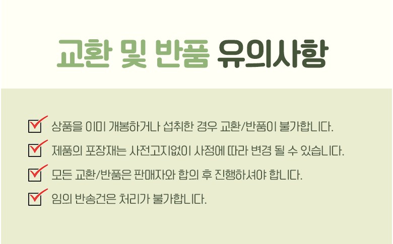 - ㆍ교환/반품에 관한 일반적인 사항은 판매자가 제시사항보다 관계법령이 우선합니다.