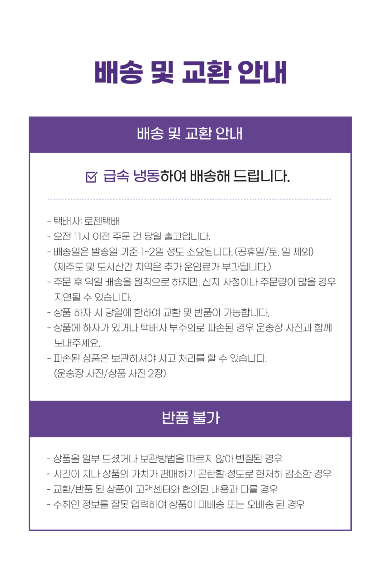 | 배송방법 | 신선/냉장/냉동 | 배송비 | 무료배송 - 도서산간 지역 배송불가 |