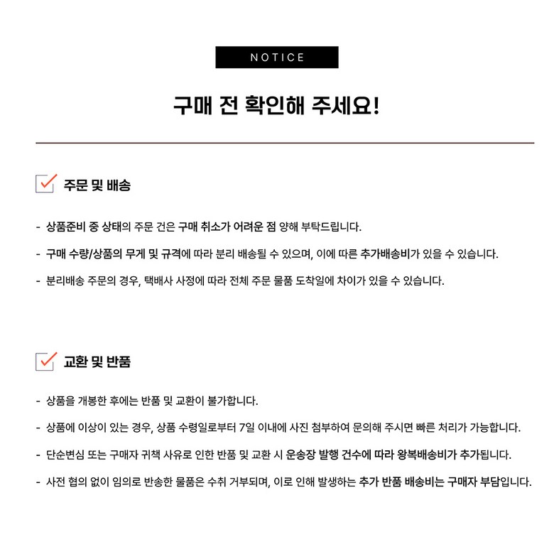 | 교환/반품 비용 (왕복비용) | 6,000원 - 단, 고객 변심의 경우에만 발생 - 도서산간 지역 배송불가 |