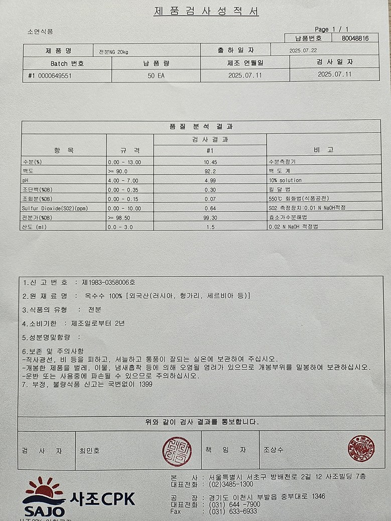 | 품목 또는 명칭 | 옥수수전분 | 포장단위별 내용물의 용량(중량),수량,크기 | 3kg |