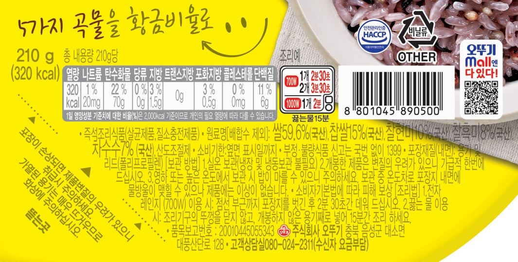 | 제품명 | 오뚜기 오곡밥 | 식품의 유형 | 즉석조리식품(살균제품.질소충전제품) |