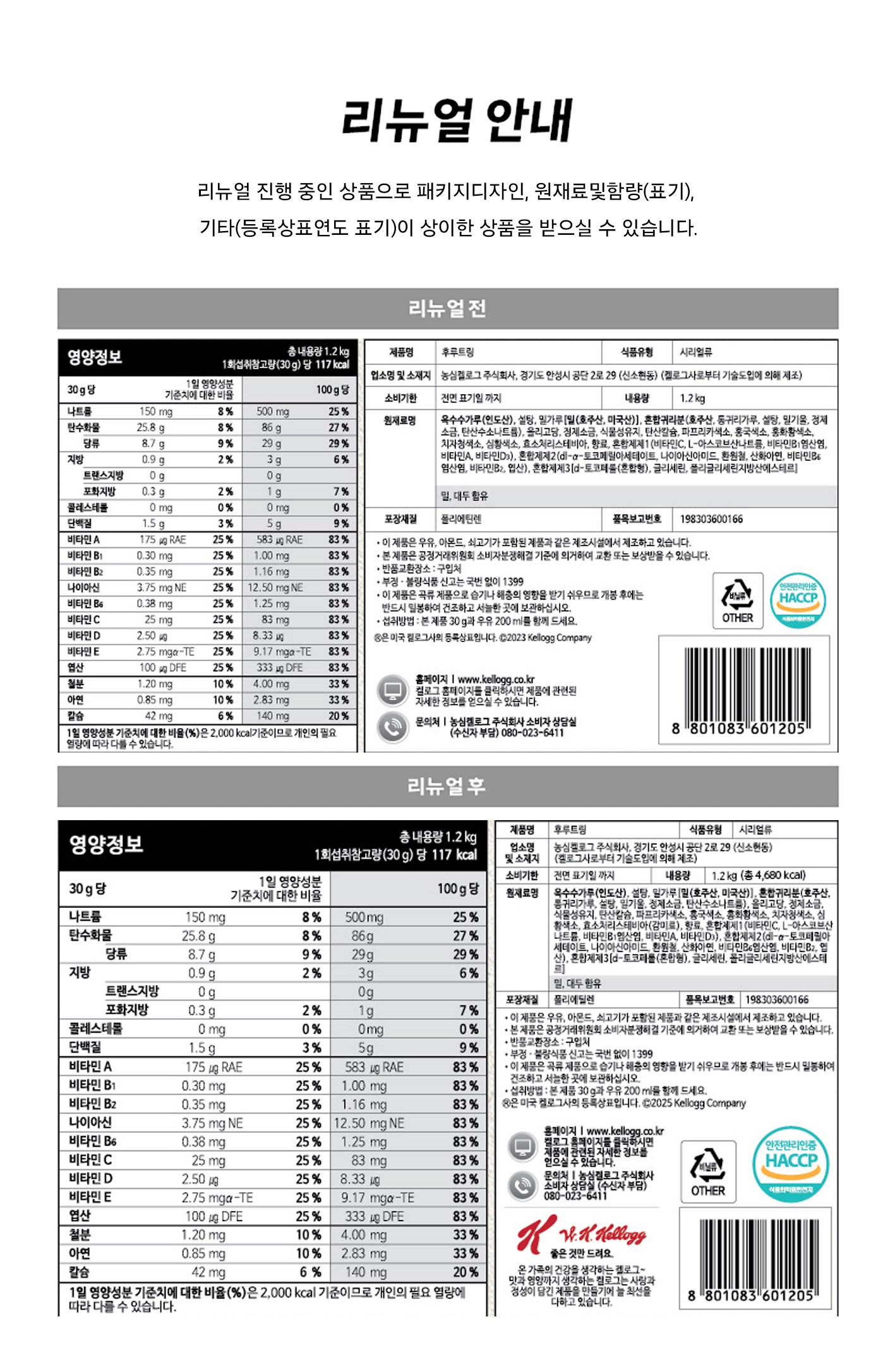 | 포장단위별 내용물의 용량(중량), 수량 | 1.2kg x 2개 | 원재료명 및 함량 | 리뉴얼 전, 후: 컨텐츠 참조 |