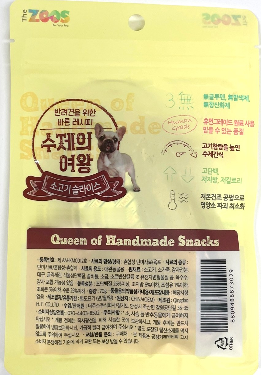 | 품명 및 모델명 | 수제의여왕 소고기슬라이스 | 인증사항 | 사료관리법에 따른 성분등록번호 : 컨텐츠 참조 |