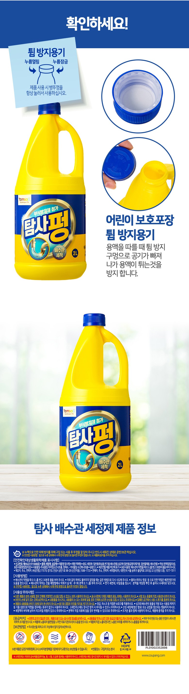 | 제조연월 및 유통기한 (유통기한의 경우 해당 없는 제품은 생략 가능) | 제조연월:제품 하단에 표기 / 유통기한:해당사항없음 | 중량∙용량∙매수∙크기 | 용량:2L |
