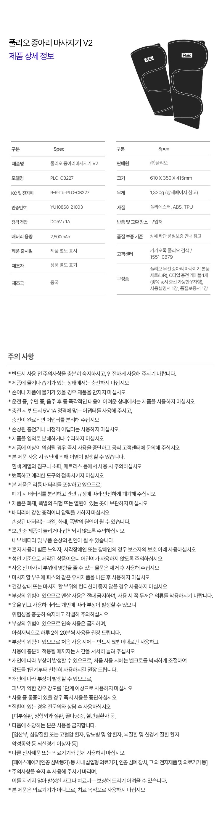 | 품명 및 모델명 | 풀리오 종아리 마사지기V2 / PLO-CB227 | KC 인증정보 | 본품: R-R-lfb-PLO-CB227 | 전지: YU10868-21003 |