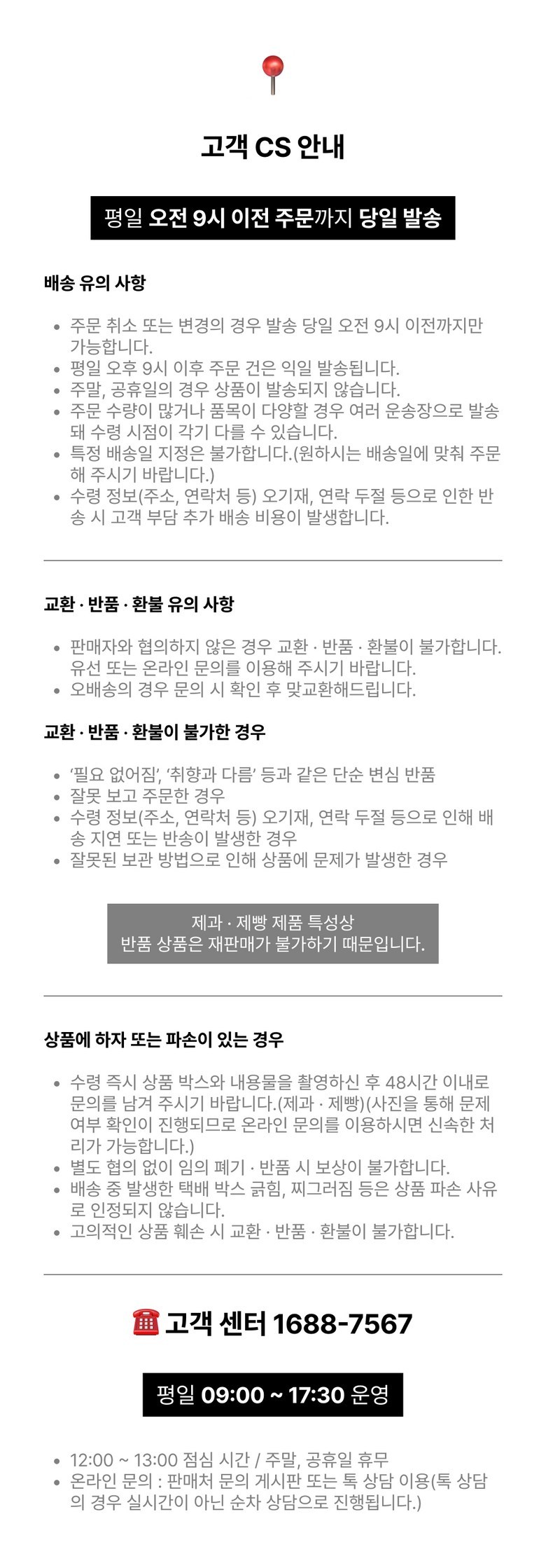 - 가격, 판매자, 교환/환불 및 배송 등 해당 상품 자체와 관련 없는 문의는 고객센터 내 1:1 문의하기를 이용해주세요.