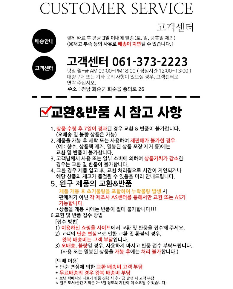 - ㆍ모니터 해상도의 차이로 인해 색상이나 이미지가 실제와 달라, 고객이 단순 변심으로 교환/반품을 무료로 요청하는 경우