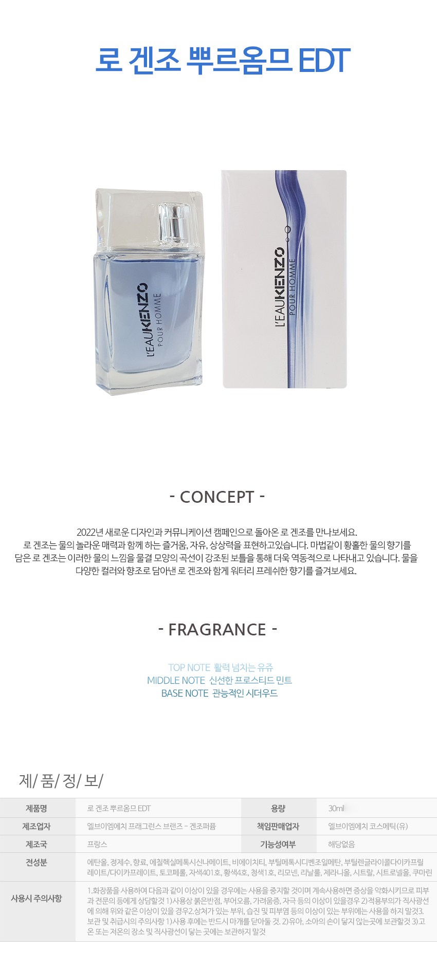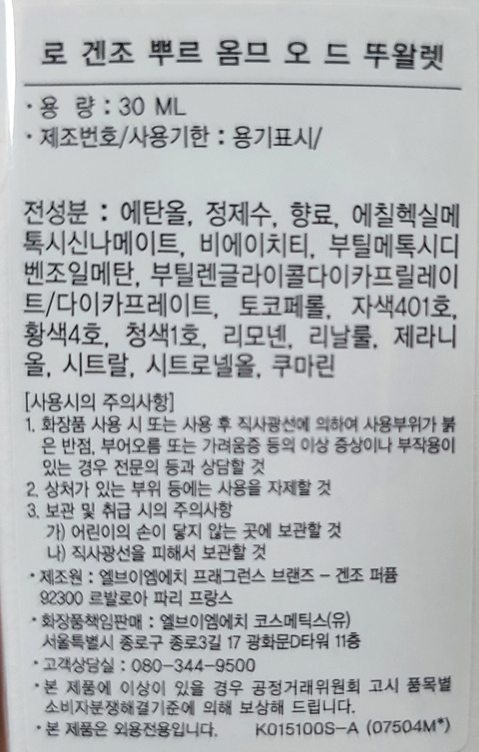 | 화장품제조업자, 화장품책임판매업자 및 맞춤형화장품판매업자 | 엘브이엠에치프래그런스 브랜즈 / 엘브이엠에치 코스메틱스(유) | 제조국 | 프랑스 |