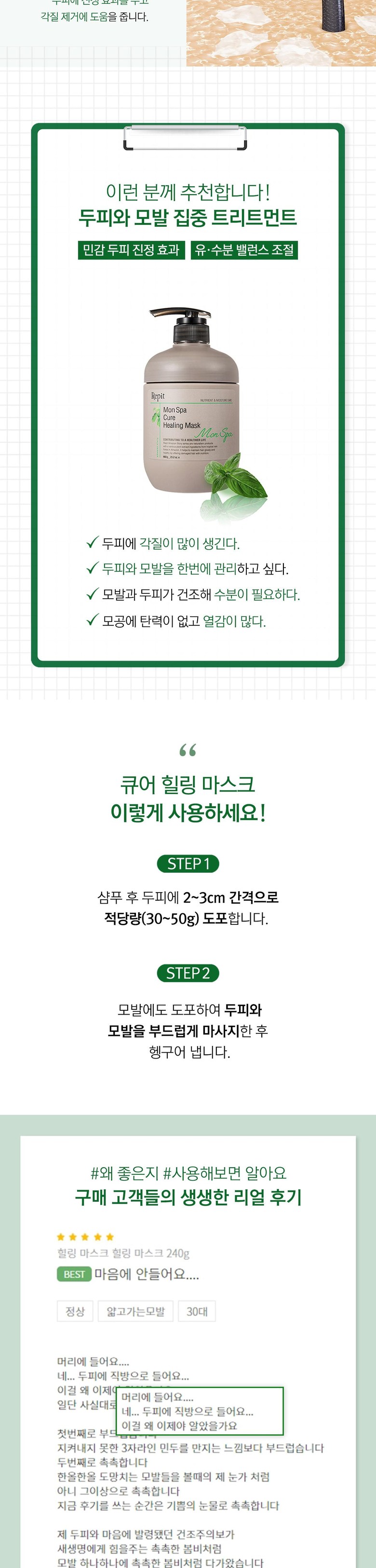 | 용량(중량) | 660g | 제품 주요 사양 | 두피와 모발을 동시에 케어하는 두피겸용 트리트먼트입니다. 풍부한 영양분을 공급해 탄력있고 단단한 두피 환경을 조성하며, 히아루론산과 EGF 등 고보습 성분이 모발을 부드럽게 감싸 촉촉하고 건강한 머릿결로 가꿔줍니다. |