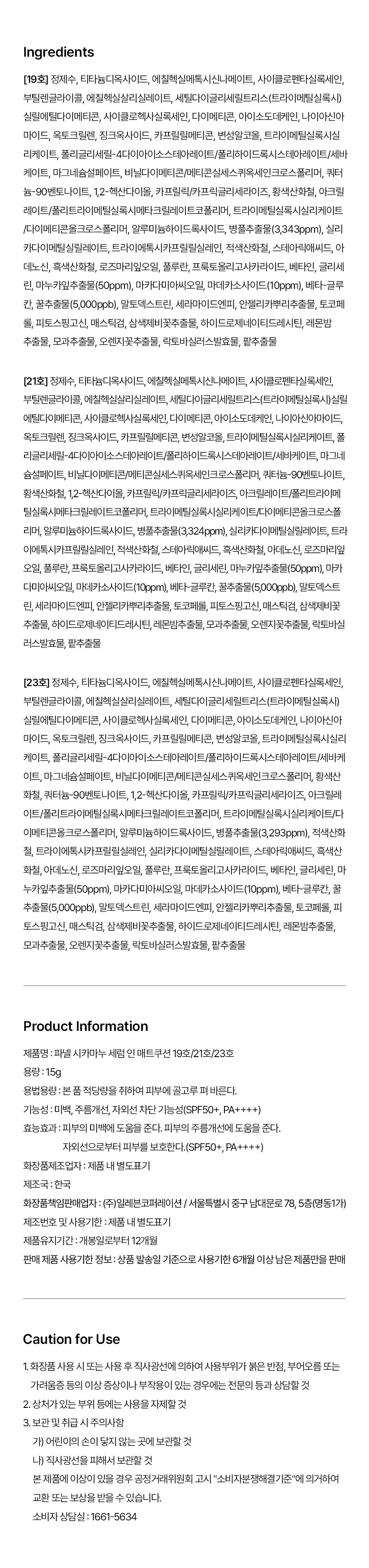 | 화장품제조업자, 화장품책임판매업자 및 맞춤형화장품판매업자 | 컨텐츠 참조 | 제조국 | 대한민국 |