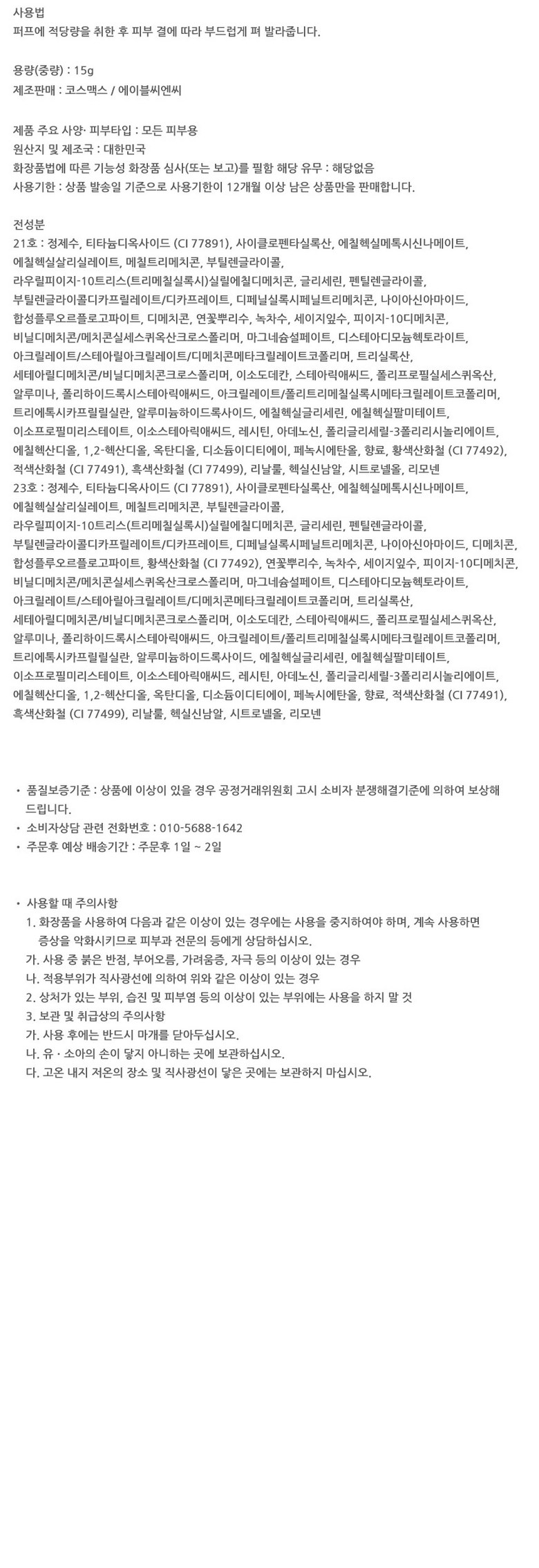 | 사용기한 또는 개봉 후 사용기간 | 상품 발송일 기준으로 사용기한이 12개월 이상 남은 상품만을 판매 합니다. | 사용방법 | 퍼프에 적당량을 취한 후 피부 결에 따라 부드럽게 펴 발라줍니다. |