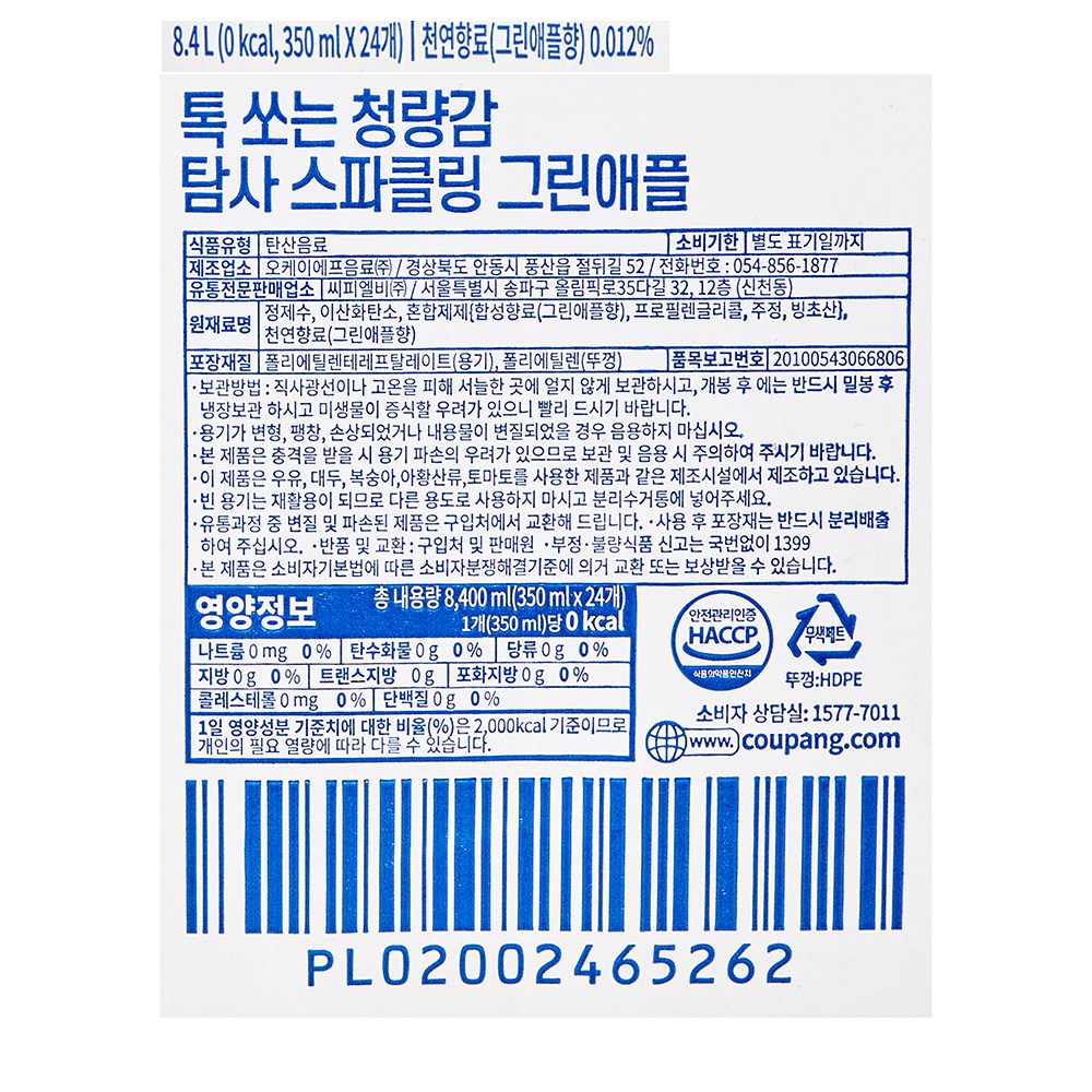 | 포장단위별 내용물의 용량(중량), 수량 | 350ml, 24개 | 원재료명 및 함량 | 컨텐츠참조 |