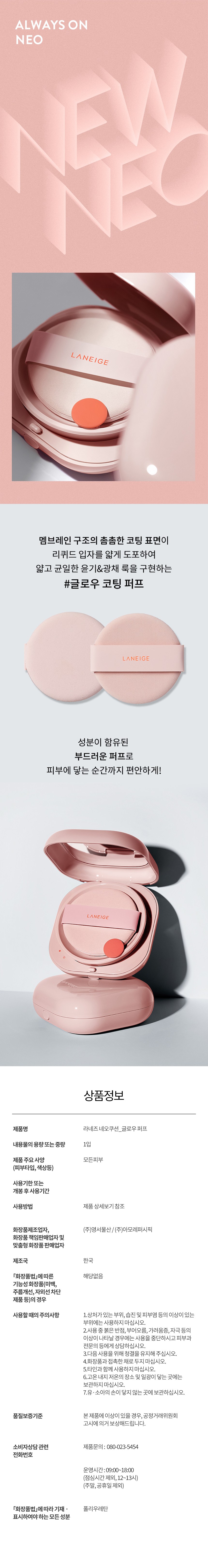 | 품명 및 모델명 | 라네즈 네오 쿠션 글로우 퍼프 | 인증/허가 사항 | 해당없음 |