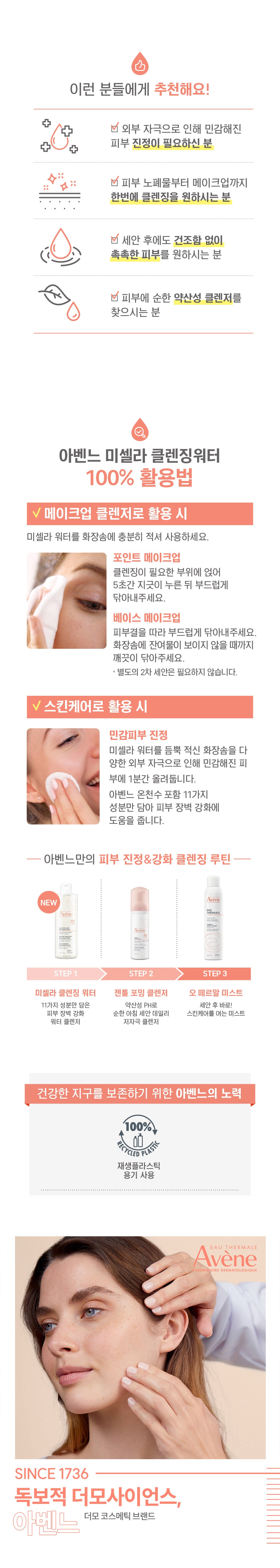 | 사용기한 또는 개봉 후 사용기간 | 본 상품은 해당 물류센터 직발송 상품인 관계로 제조연월일 및 사용기한 정보가 매번 변경되므로 상단 사용기한 정보를 참고해 주세요. | 사용방법 | 클렌징 워터를 화장솜에 듬뿍 적신 후, 피부결을 따라 부드럽게 닦아줍니다. 포인트 메이크업은 5초 정도 지그시 눌러준 뒤 닦아내면 더욱 순하게 지울 수 있습니다. 진정이 필요한 피부에 듬뿍 적신 화장솜을 올려두어도 좋습니다. 별도의 물 세안이 필요 없습니다. |