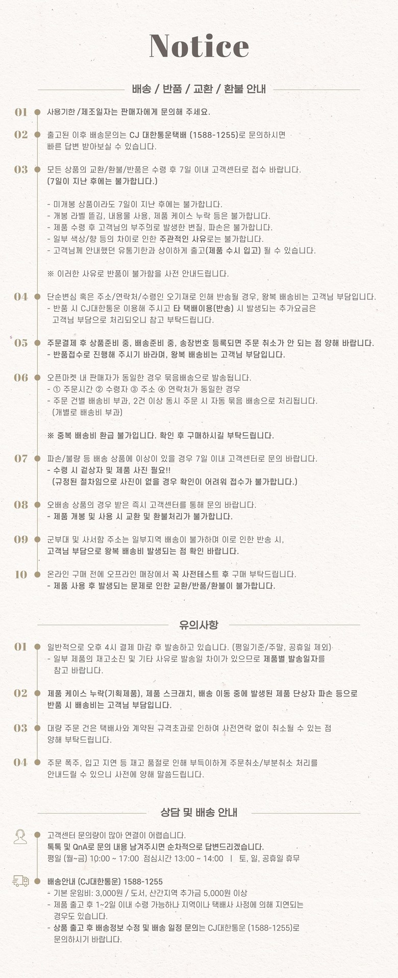 - ㆍ모니터 해상도의 차이로 인해 색상이나 이미지가 실제와 달라, 고객이 단순 변심으로 교환/반품을 무료로 요청하는 경우