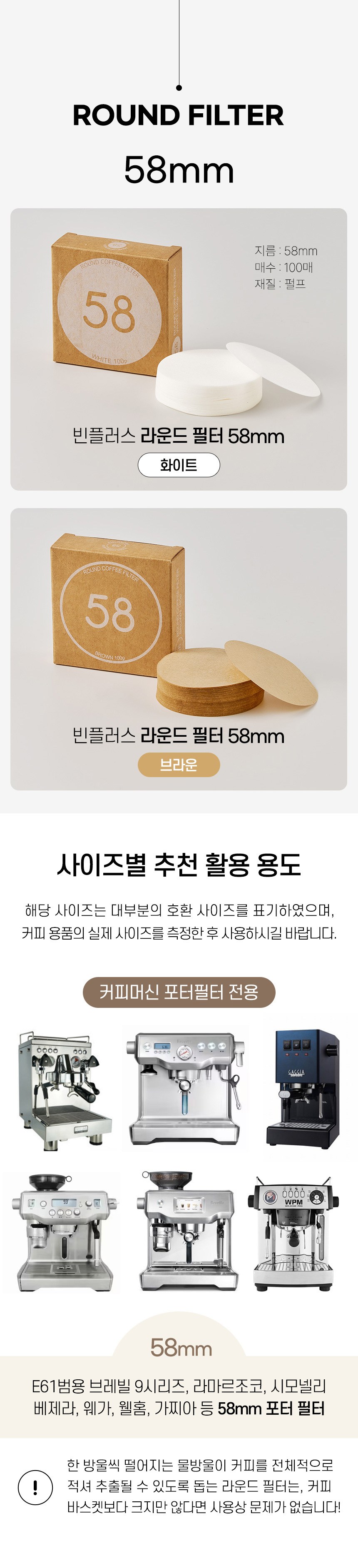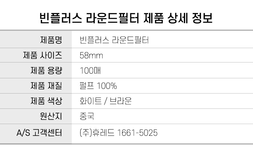 | 품명 및 모델명 | 빈플러스 라운드 원형 커피 필터 여과지 브라운 커피머신 포터필터 페이퍼 58mm 100매 | 재질 | 종이제 |