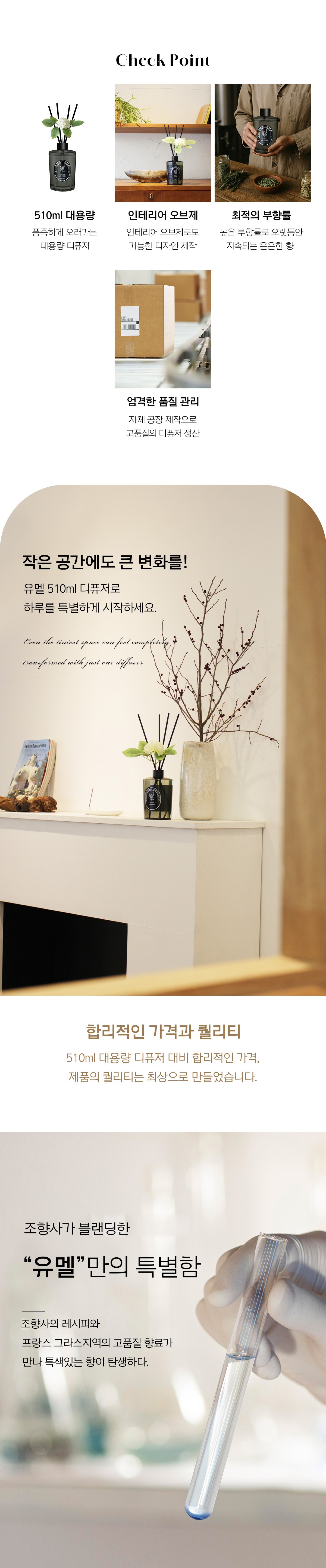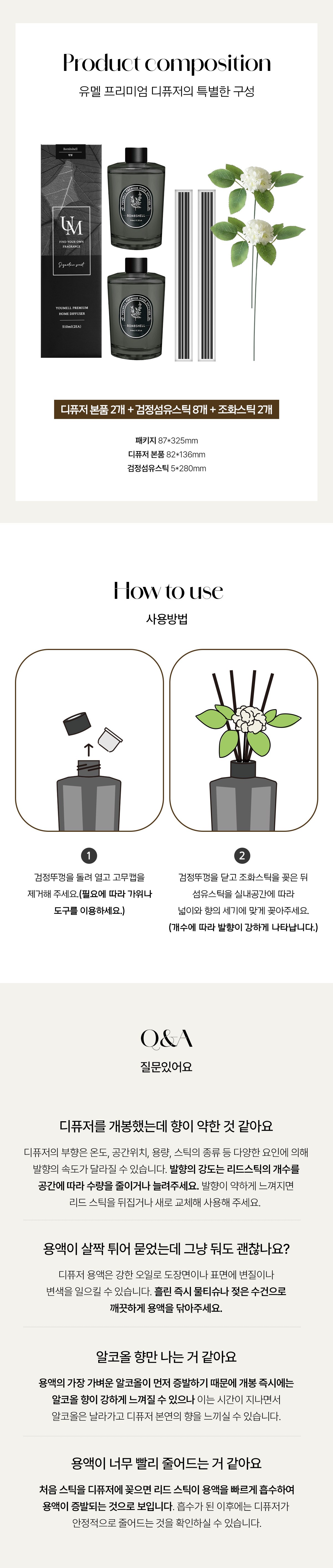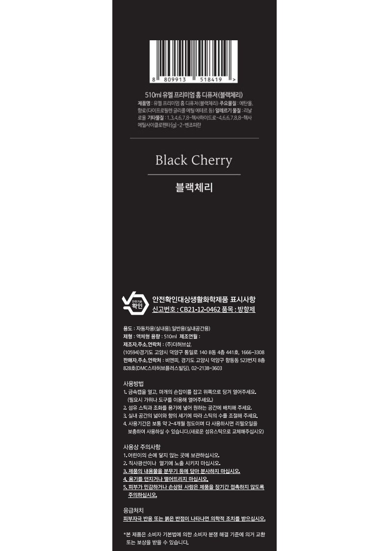 | 품목 및 제품명 | 방향제 / 유멜 프리미엄 홈 디퓨저 (블랙체리) | 용도(표백제의 경우 계열을 함께표시) 및 제형 | 일반용(실내공간용) , 자동차용(실내용) / 액체형 |