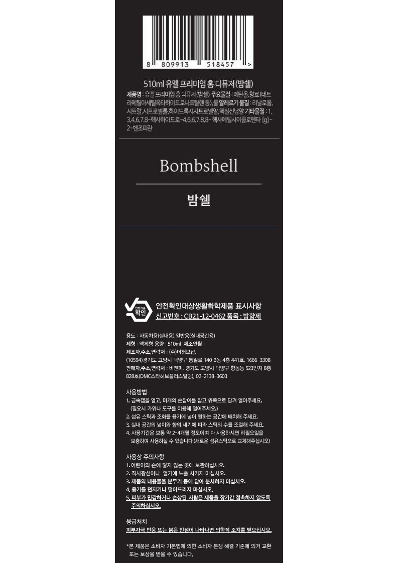 | 품목 및 제품명 | 방향제 / 유멜 프리미엄 홈 디퓨저 (밤쉘) | 용도(표백제의 경우 계열을 함께표시) 및 제형 | 일반용(실내공간용) , 자동차용(실내용) / 액체형 |