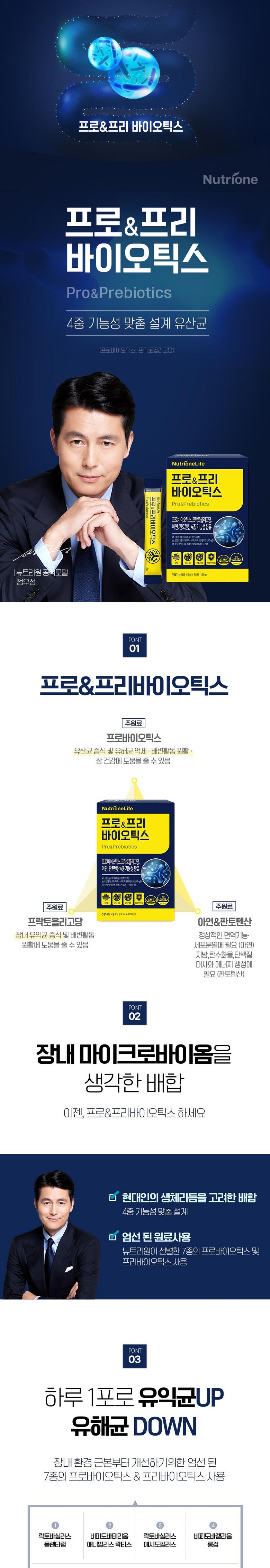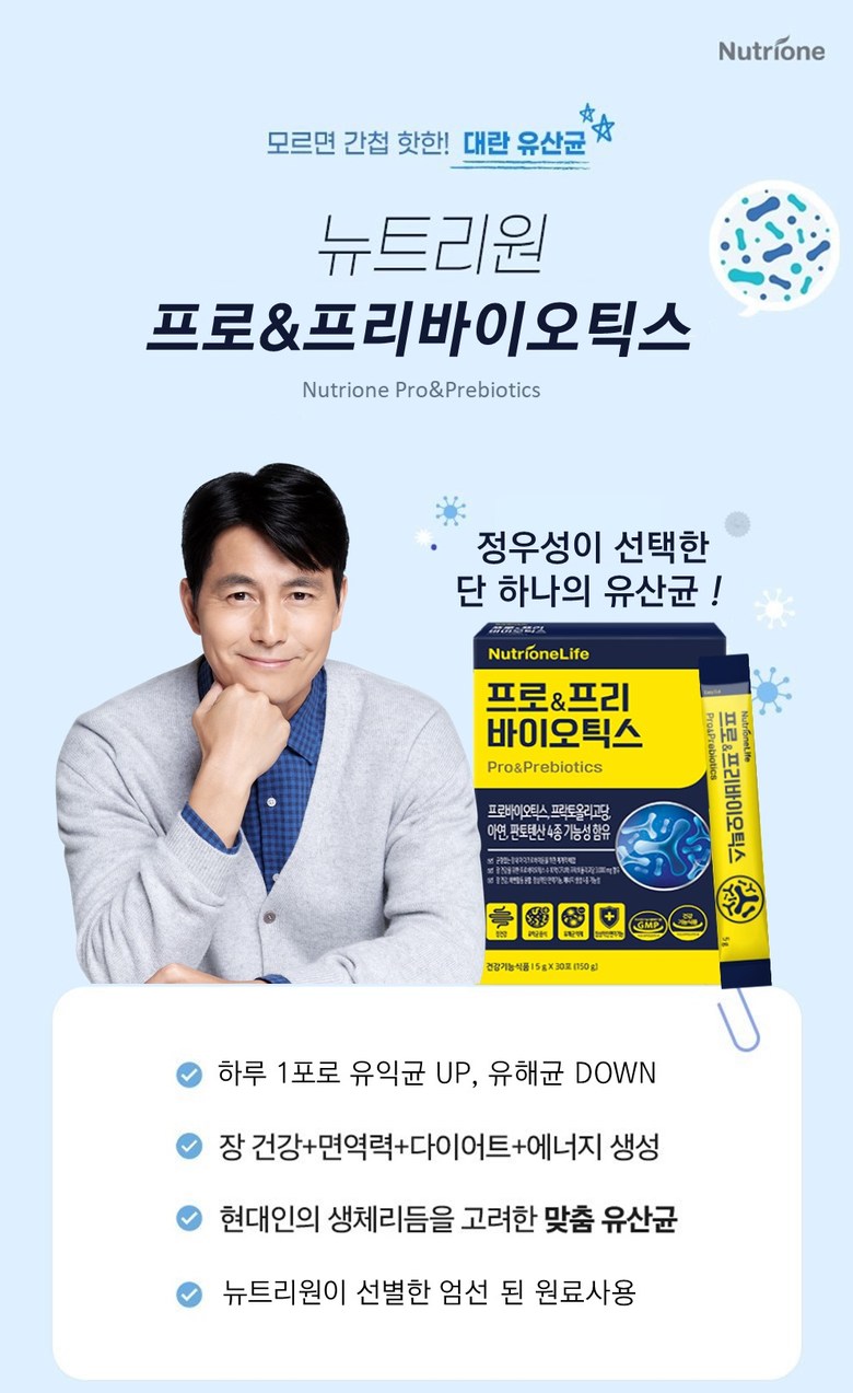 | 원료명 및 함량 | 프락토올리고당, 7종혼합유산균, 산화아연, 판토텐산칼슘, 요구르트혼합[덱스트린, 혼합탈지유발효고형분(탈지분유, 유청분말), 포도당], 포도당, 혼합탈지분유(탈지분유, 탈염 웨이퍼미에이트), 자일리톨, 대나무수액추출분말, 무수구연산 | 영양정보 | 1일 섭취량-1포 (5 g) 열량20 kcal, 탄수화물 5 g(2%), 단백질 0 g(0%), 지방 0 g(0%), 나트륨 0 mg(0%), 프로바이오틱스 수 1,000,000,000(10억)CFU, 프락토올리고당 3,000 mg, 아연 8.5 mg(100%), 판토텐산 5mg(100%) |