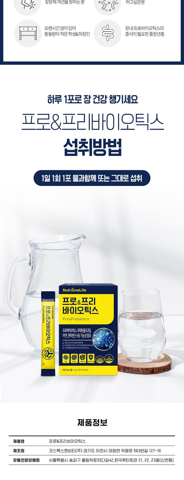 | 소비기한 및 보관방법 | 제조일로부터 18개월 까지 | 포장단위별 내용물의 용량(중량), 수량 | 5g x 30포(150g) x 1박스 [1개월분] |