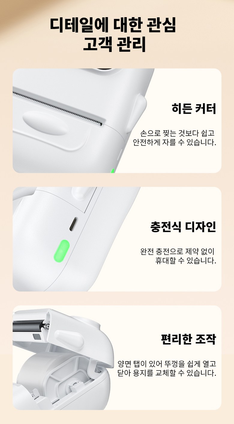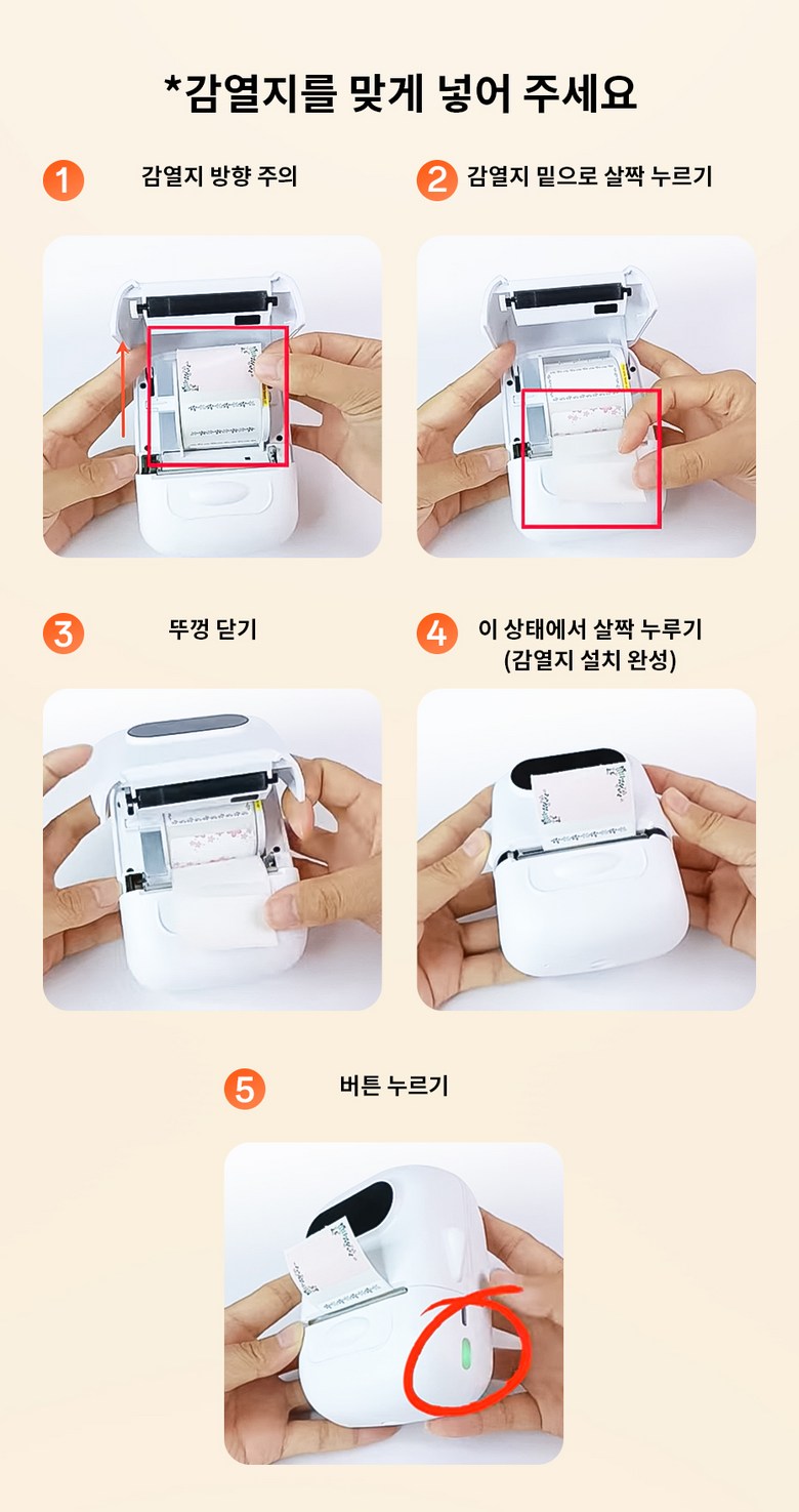 *설치 단계: 1.라벨지 넣음, 전원 켜기 2.라벨지 보정(매번 사용할 때 전원 켜진 상태 버튼 2번 누르기)