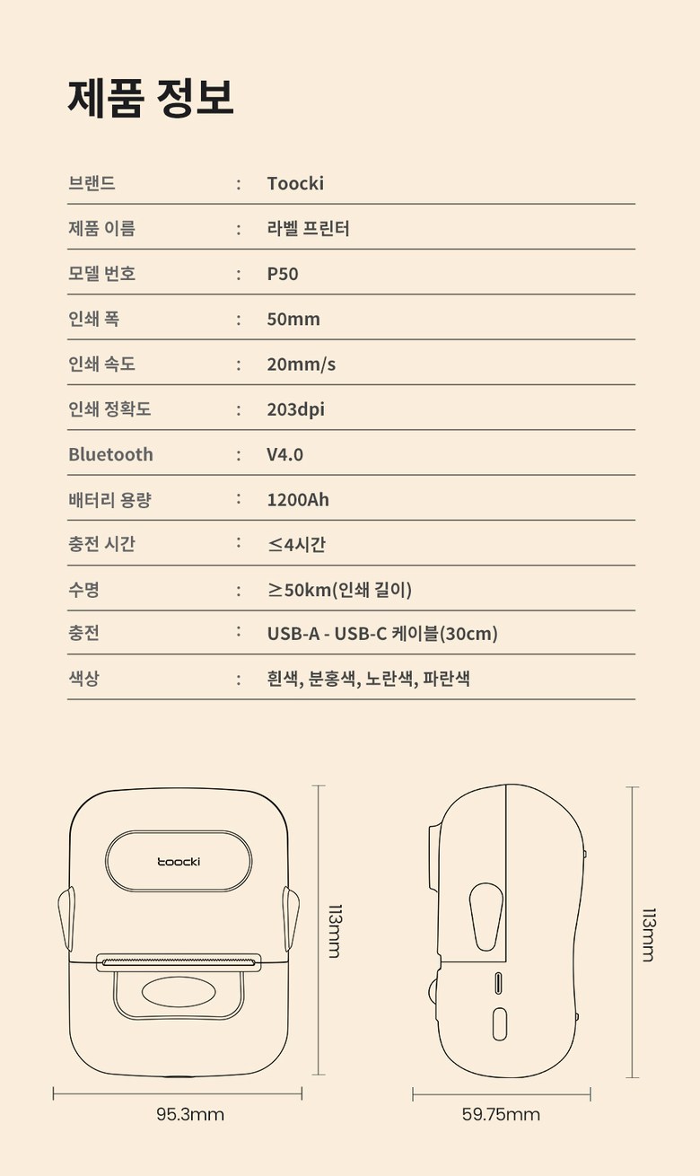 | 품명 및 모델명 | Toocki 블루투스 무선 감열식 휴대용 미니 라벨 프린터 (감열지 포함) | KC 인증정보 | P12:R-R-YXQ-P12P50:R-R-YXQ-P50 |