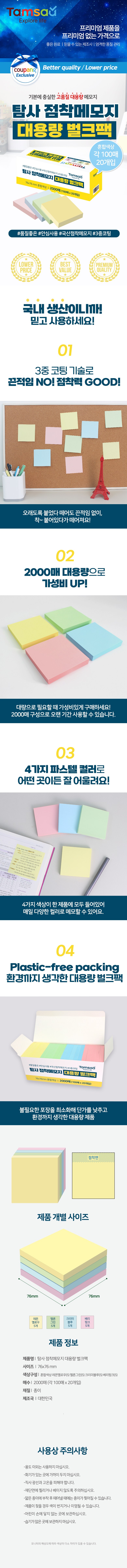 | 품명 및 모델명 | 탐사 점착메모지 대용량팩 76x76mm, 혼합색상 100매 20개 1세트 | 인증/허가 사항 | 해당없음 |