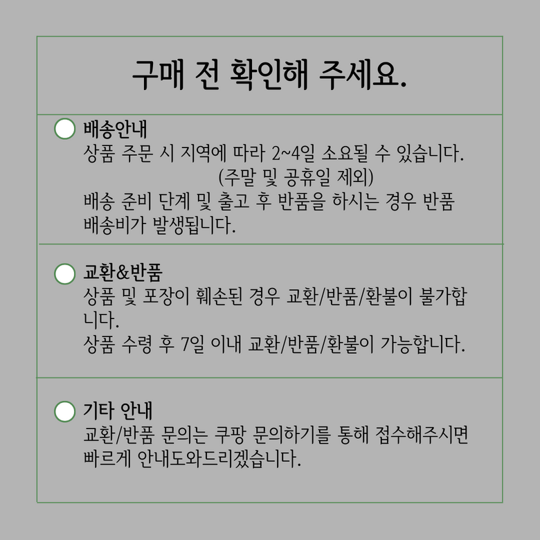 - ㆍ모니터 해상도의 차이로 인해 색상이나 이미지가 실제와 달라, 고객이 단순 변심으로 교환/반품을 무료로 요청하는 경우