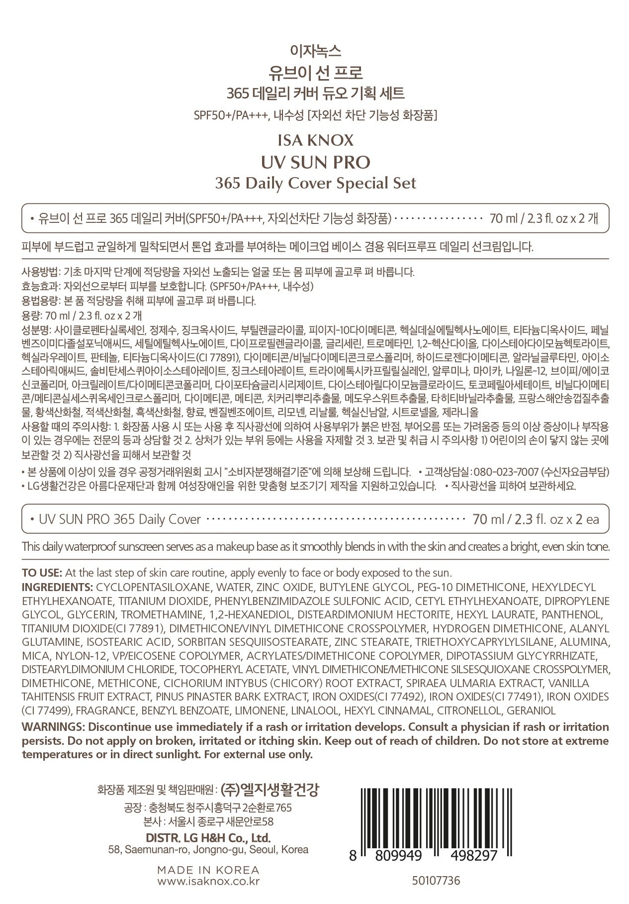 이자녹스 유브이 선프로 선크림 365 데일리 SPF50+ PA+++ 선블록/선크림/선로션, 70ml, 2개