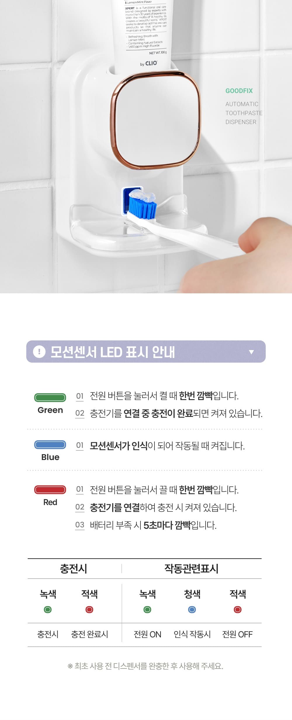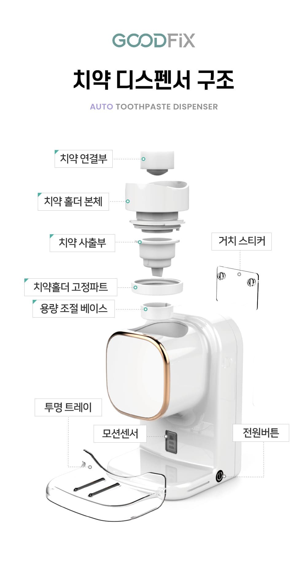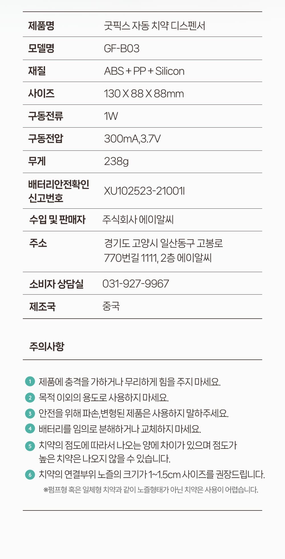 | 품명 및 모델명 | 굿픽스 자동 센서 치약디스펜서 / GF-B03 | KC 인증정보 | 본품: 해당없음 / 전지: XU102523-21001I |