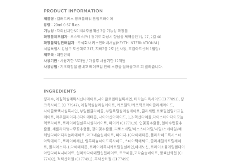 | 화장품제조업자, 화장품책임판매업자 및 맞춤형화장품판매업자 | 상품 상세페이지 참조 | 제조국 | 상품 상세페이지 참조 |