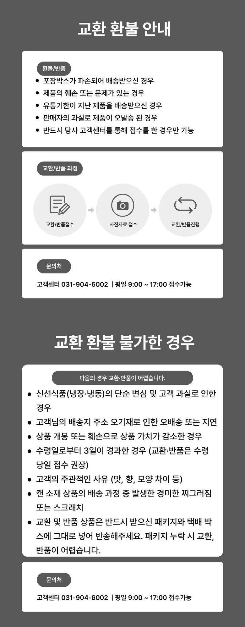 | 교환/반품 신청 기준일 | ㆍ단순변심에 의한 교환/반품은 제품 수령 후 7일 이내까지, 교환/반품 제한사항에 해당하지 않는 경우에만 가능 (배송비용과 교환/반품 비용 왕복배송비 고객부담) ㆍ상품의 내용이 표시·광고의 내용과 다른 경우에는 상품을 수령한 날부터 3개월 이내, 그 사실을 안 날 또는 알 수 있었던 날부터 |