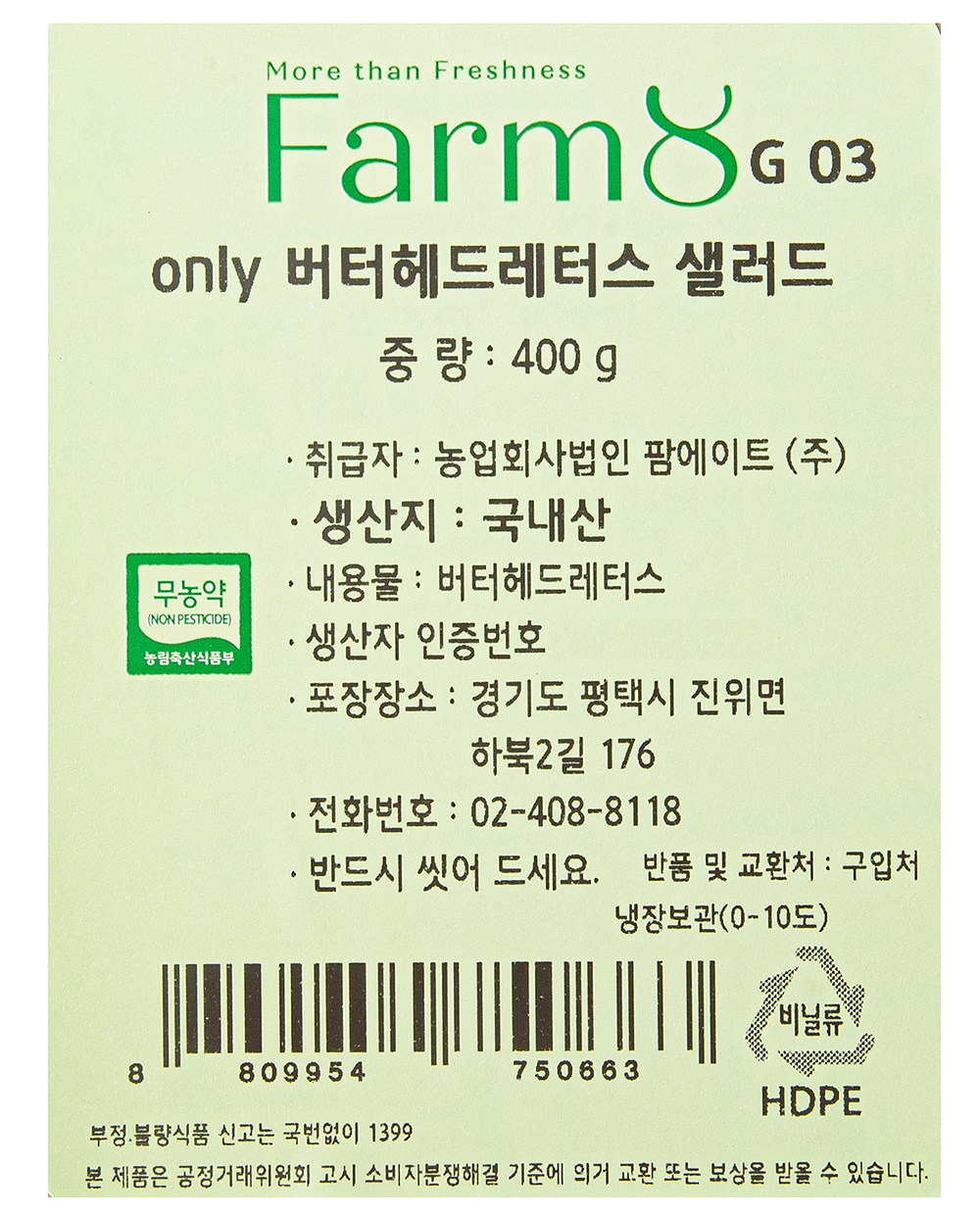 | 품목 또는 명칭 | only 버터헤드레터스 샐러드 | 포장단위별 내용물의 용량(중량),수량,크기 | 400g x 1개입 x 3개 |