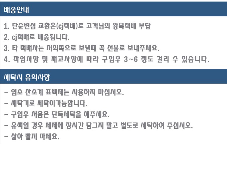 - ㆍ모니터 해상도의 차이로 인해 색상이나 이미지가 실제와 달라, 고객이 단순 변심으로 교환/반품을 무료로 요청하는 경우