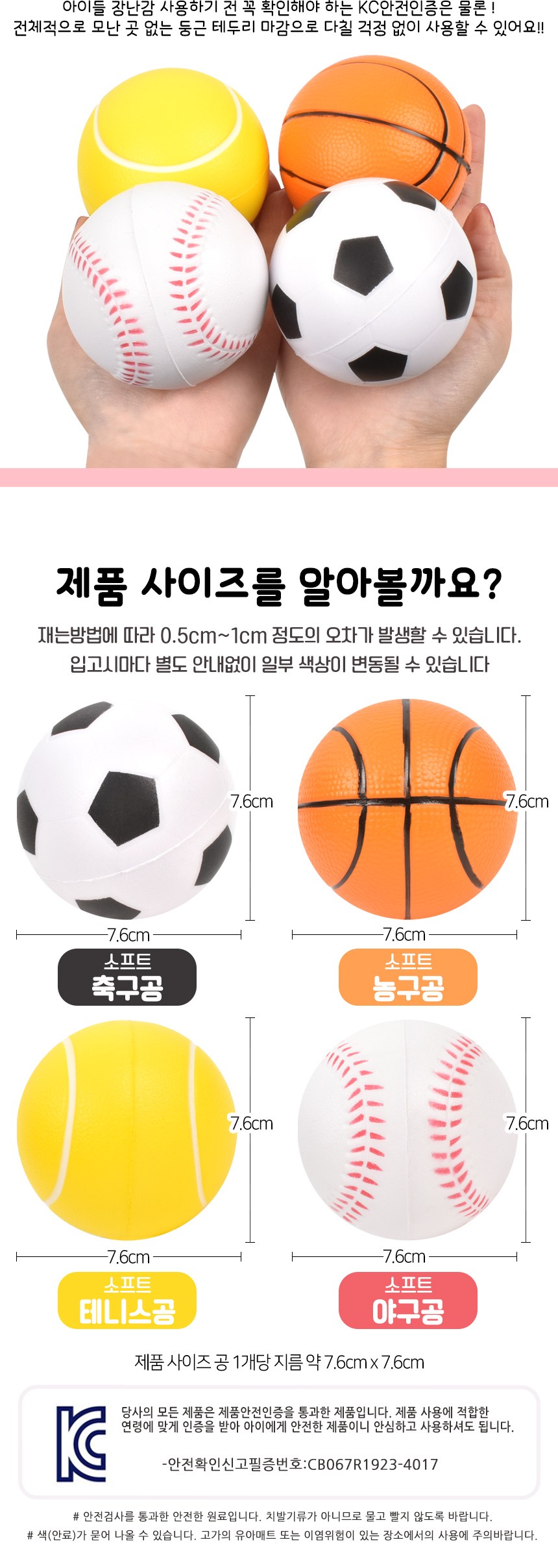 | 품명 및 모델명 | 말랑말랑 스펀지 스포츠 공 4종 (야구공+테니스공+농구공+축구공) | KC 인증정보 | CB067R1923-4017 |