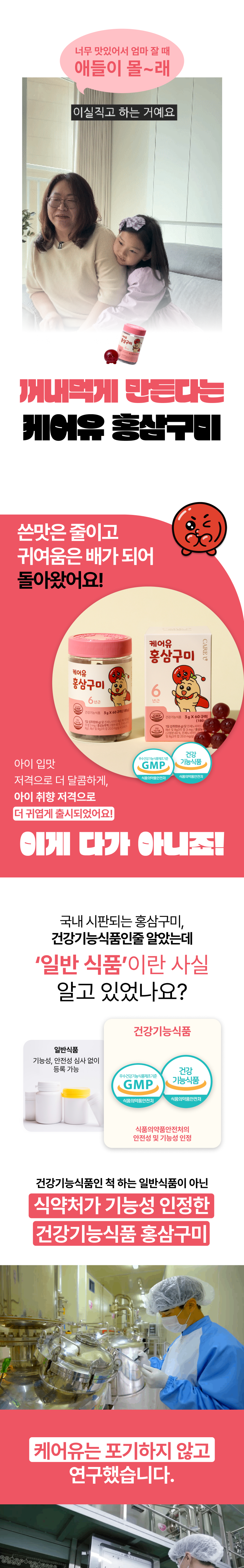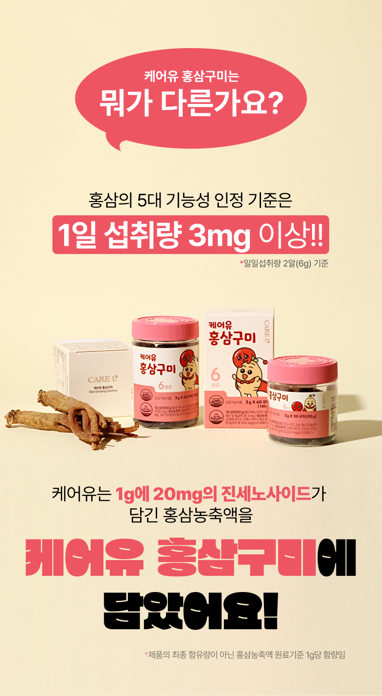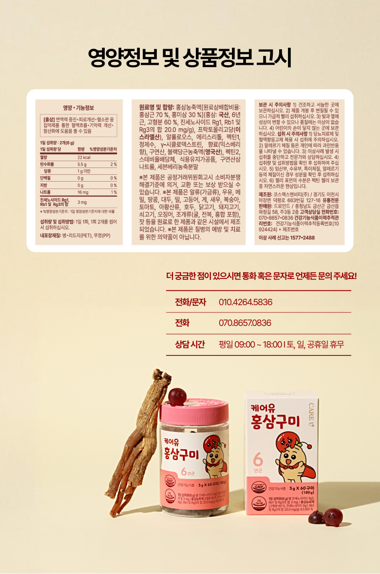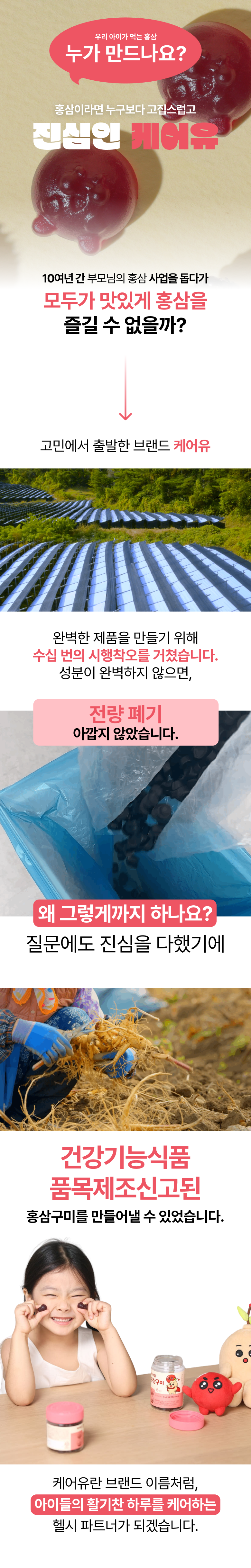 | 제품명 | 케어유 홍삼구미 60구미 | 제조업소의 명칭과 소재지 | 드로인드 / 충청남도 금산군 금산읍 와정길 58 주3동 2층, 케어유 |