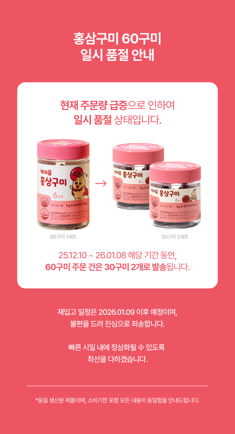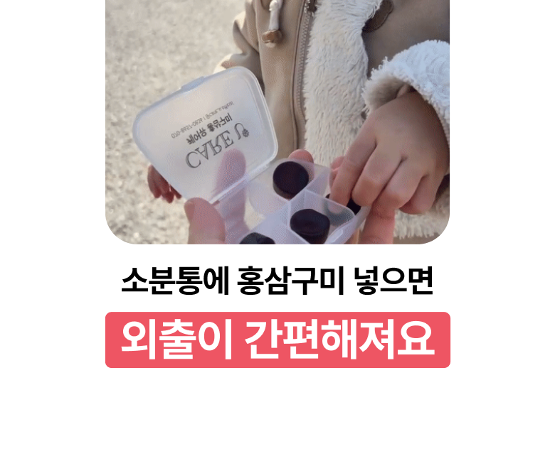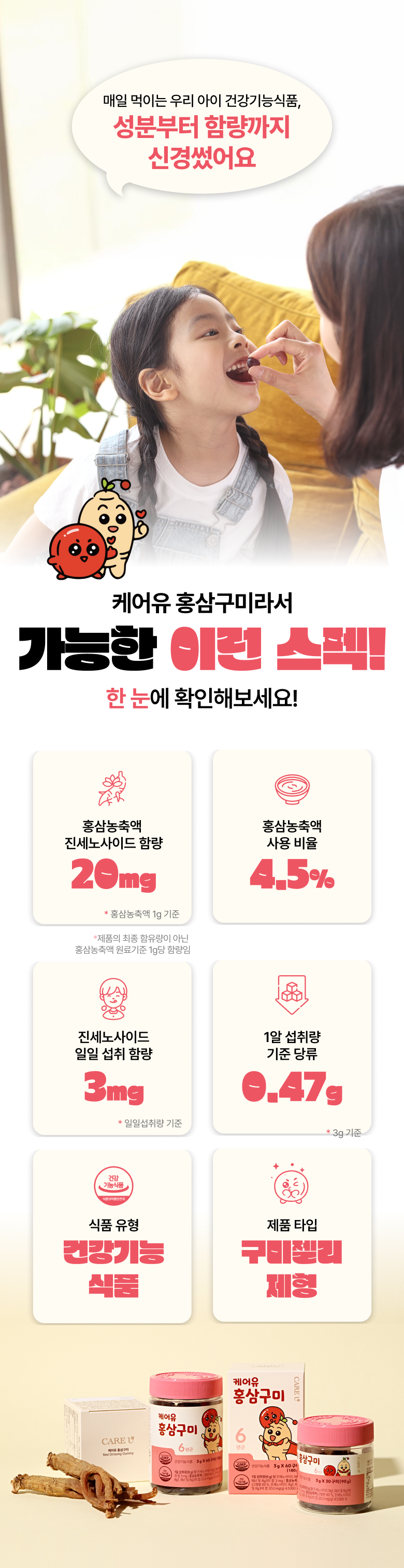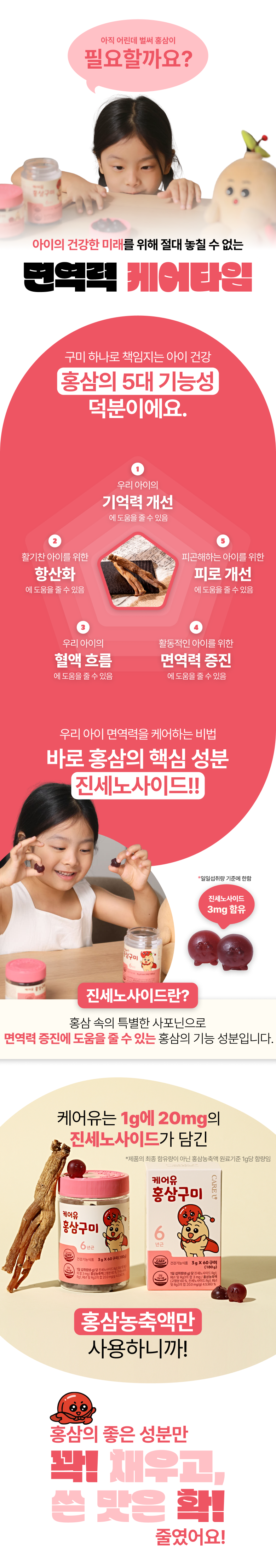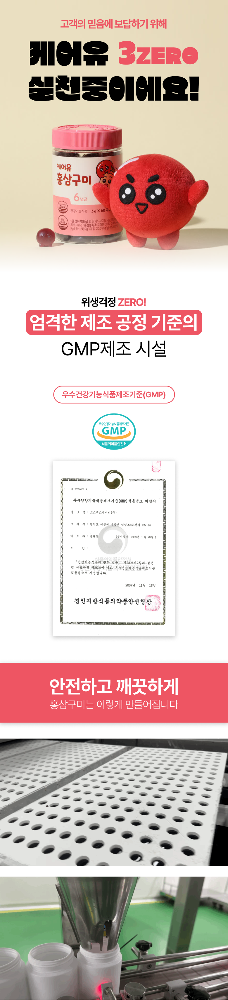| 제품명 | 케어유 홍삼구미 60구미 | 제조업소의 명칭과 소재지 | 드로인드 / 충청남도 금산군 금산읍 와정길 58 주3동 2층, 케어유 |