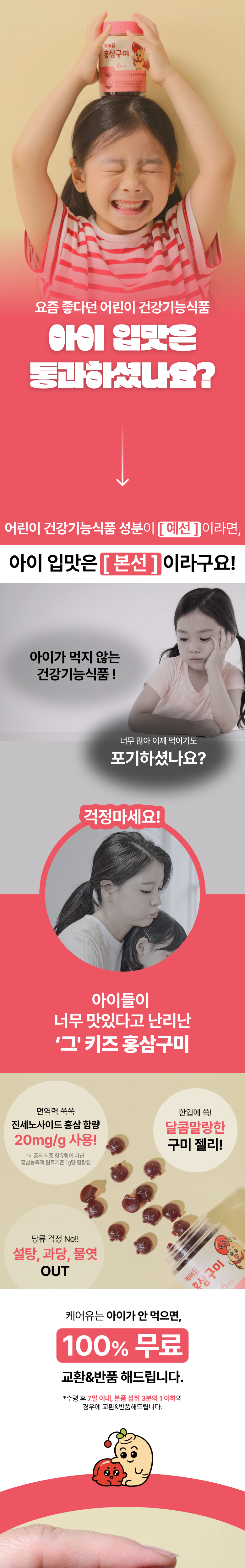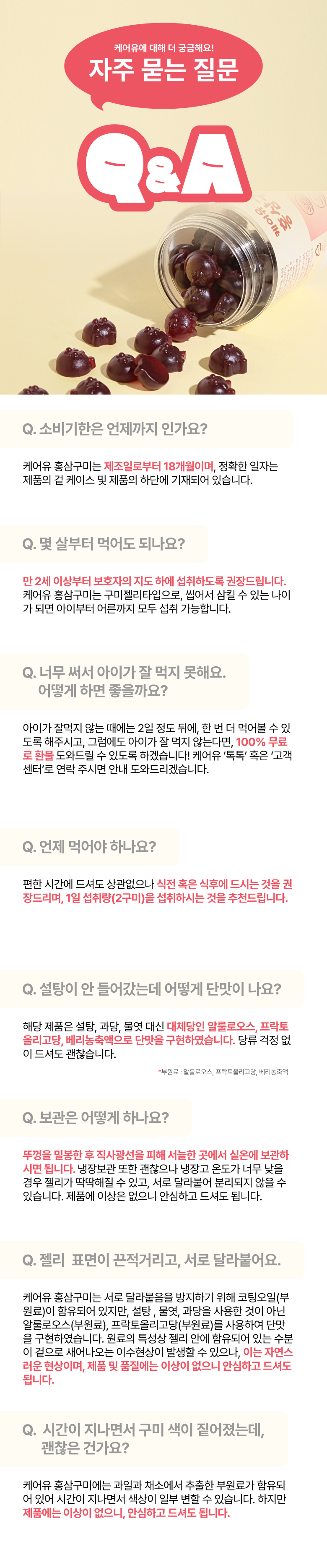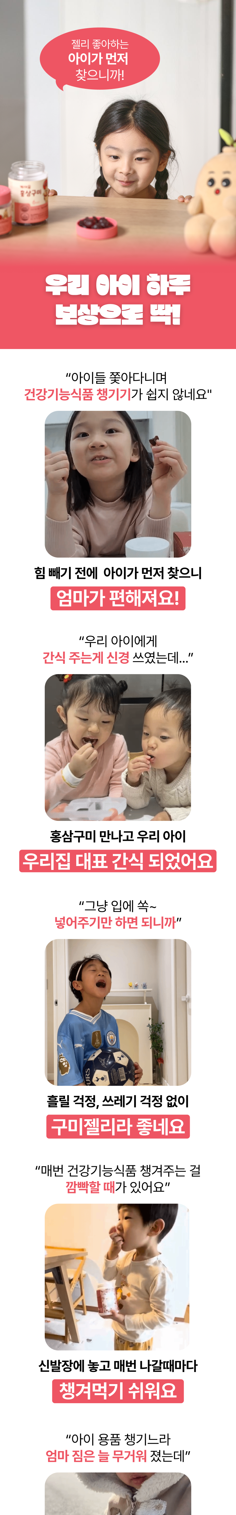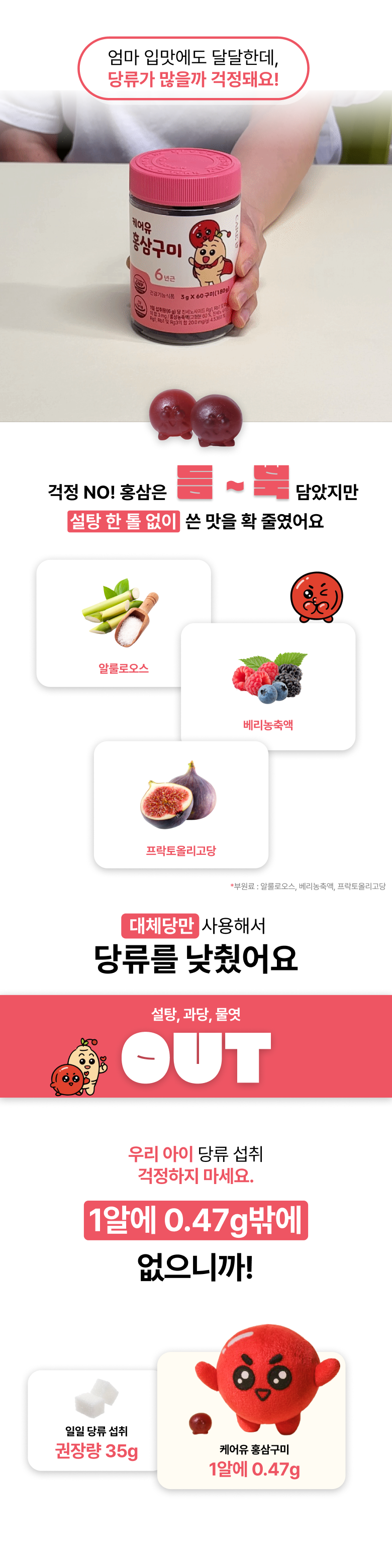 | 원료명 및 함량 | 홍삼농축액 4.5% [원료삼배합비율: 홍삼근 70%, 홍미삼 30%](홍삼:국산, 6년근, 고형분 60%, 진세노사이드 Rg1, Rb1 및 Rg3의 합 20.0mg/g), 프락토올리고당(이스라엘산), 알룰로오스, 에리스리톨, 펙틴분말, y-시클로덱스트린, 향료(베리믹스향), 구연산(무수), 정제수, 블랙당근농축액(영국산), 펙틴, 스테비올배당체, 코팅오일, 구연산삼나트륨, 세븐베리농축분말 | 영양정보 | 1일 섭취량 : 2개(6g) 기준 : 진세노사이드 Rg1, Rb1, Rg3의 합 3mg, 열량 22kcal, 탄수화물 5.5g 당류 1g 미만, 단백질 0g, 지방 0g, 나트륨 16mg |