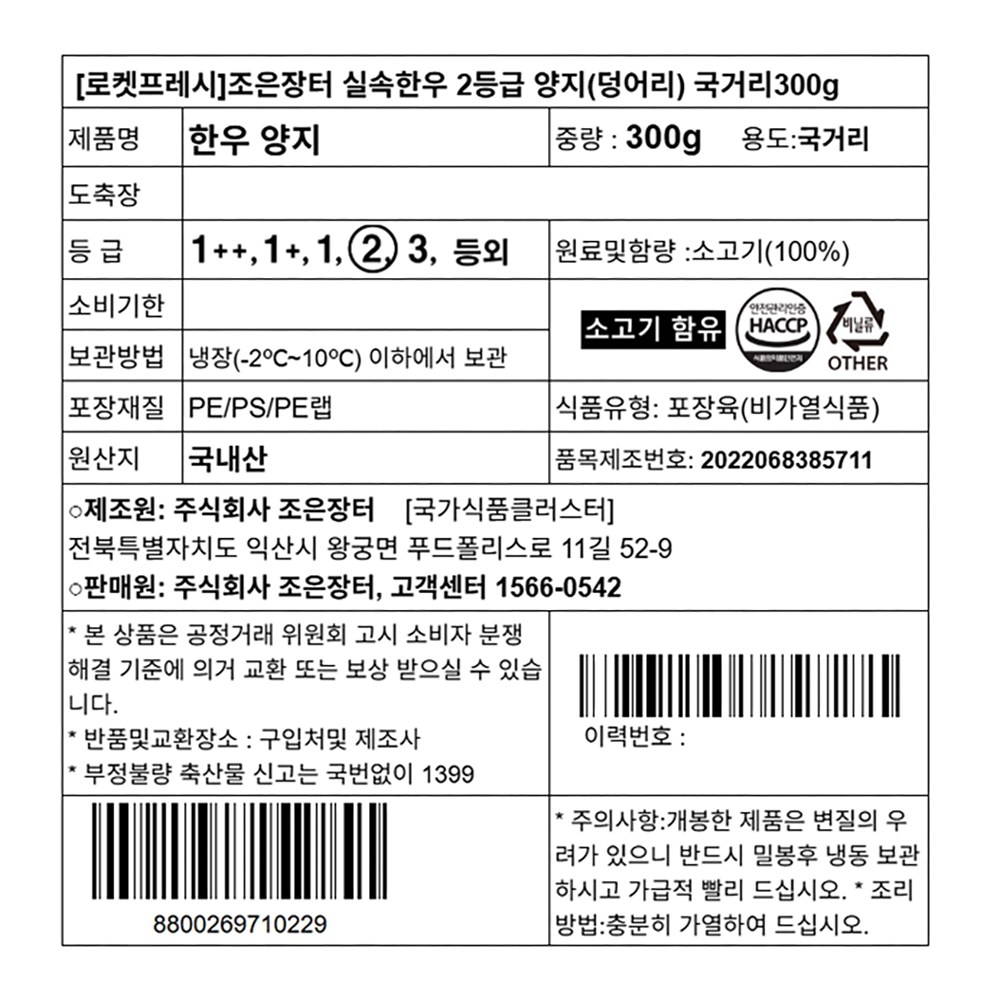 | 소비기한 또는 품질유지기한 | 소비기한(또는 유통기한) : 2026년 04월 06일 이거나 그 이후인 상품 | 세부 품목군별 표시사항 | 축산물 등급표시 : 2등급 / 이력번호 표시유무 : 이력번호 표시제품임 |