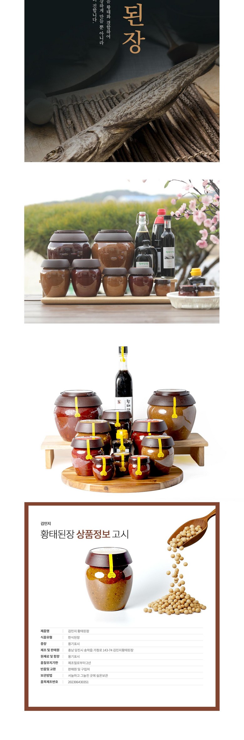 | 생산자 및 소재지 | 김민지황태된장/충남당진시송악읍가청로143-74 | 제조연월일, 소비기한 또는 품질유지기한 | 상품 상세페이지 참조 |
